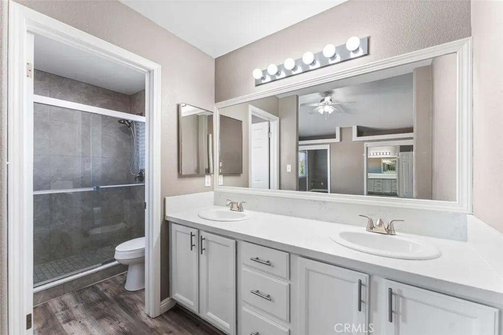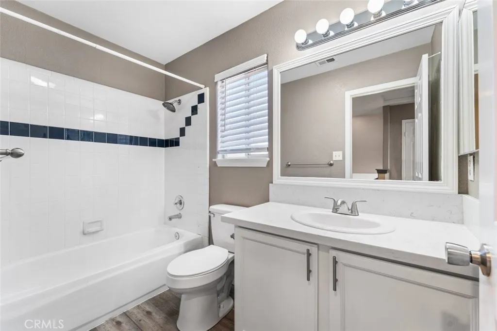 The kitchen boasts stainless steel appliances, recessed lighting, and plenty of cabinetry for storage. A stylish staircase leads to the second floor, where you’ll find spacious bedrooms with mirrored closet doors. The main bedroom offers a relaxing retreat complete with a dual-sink vanity and ample closet space.
