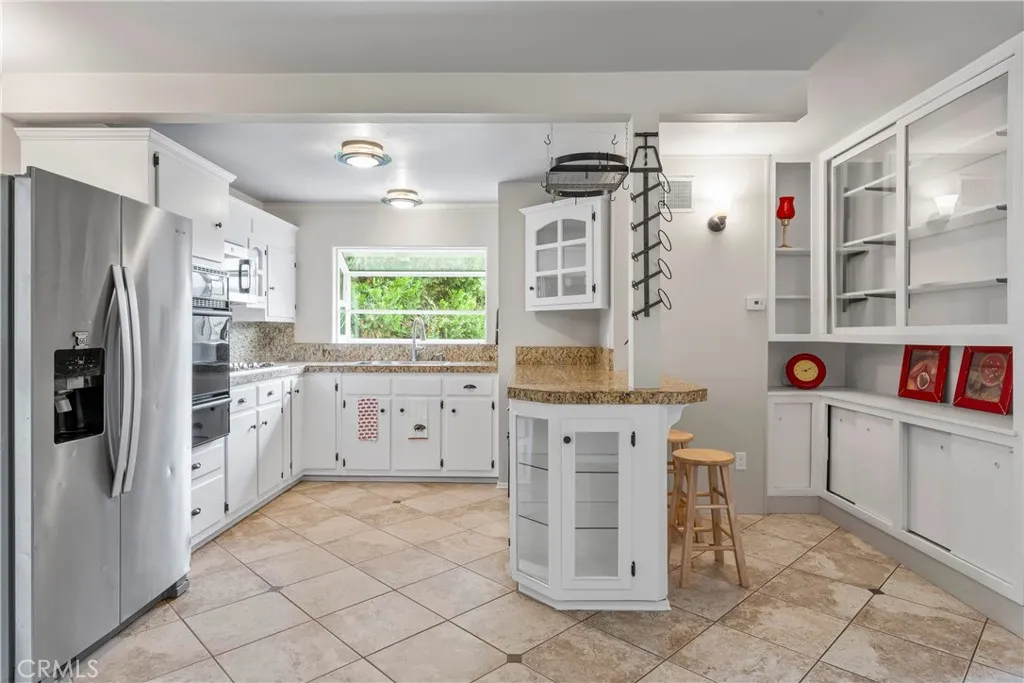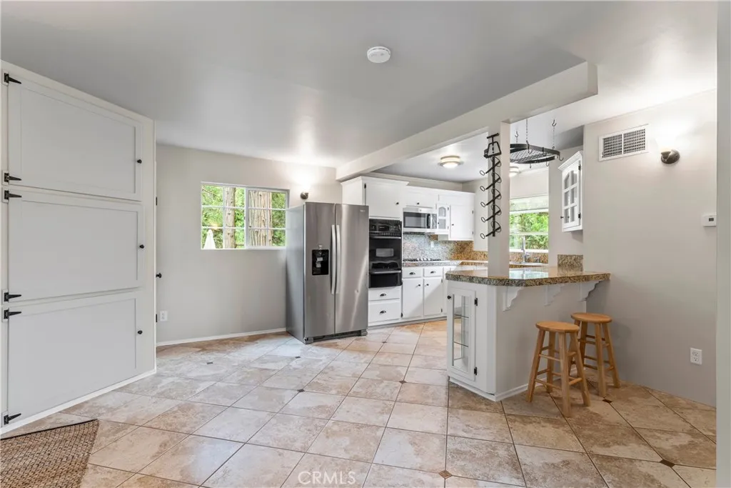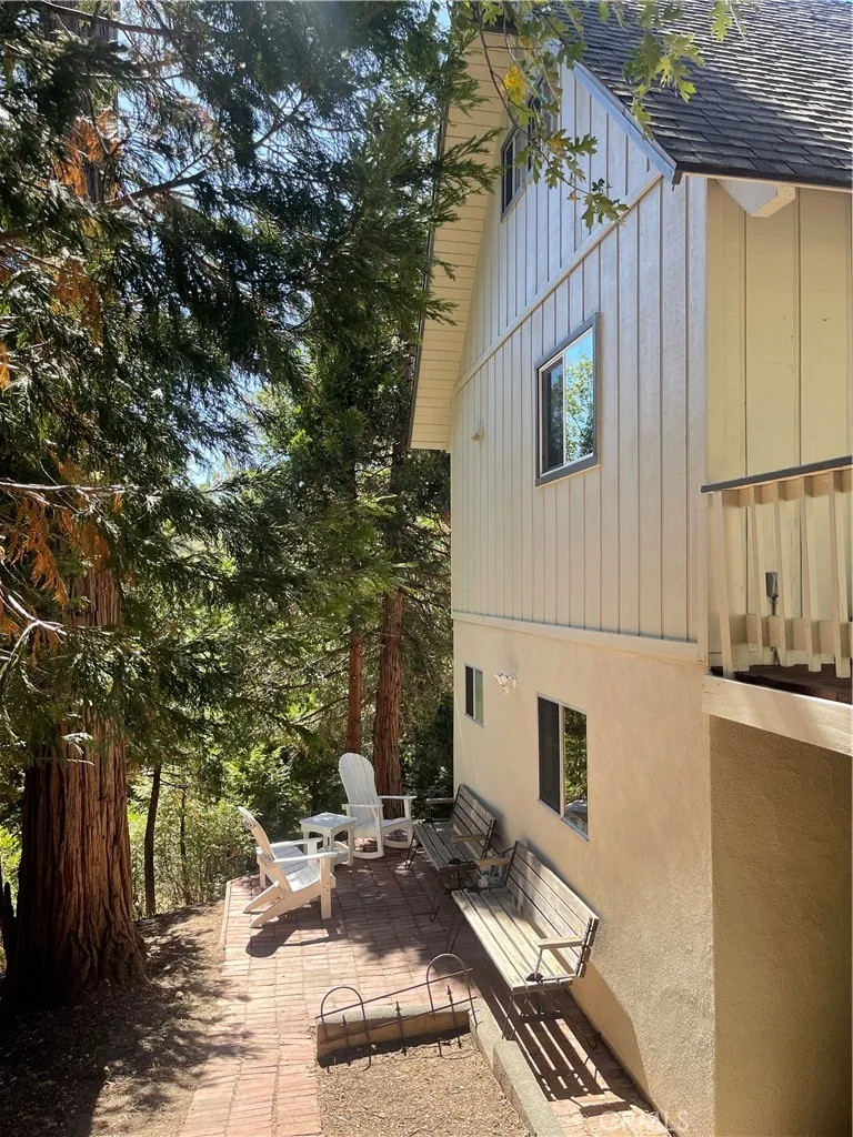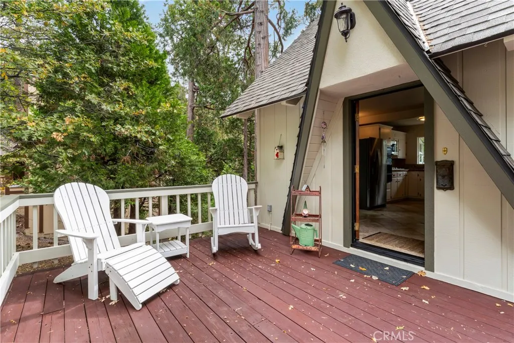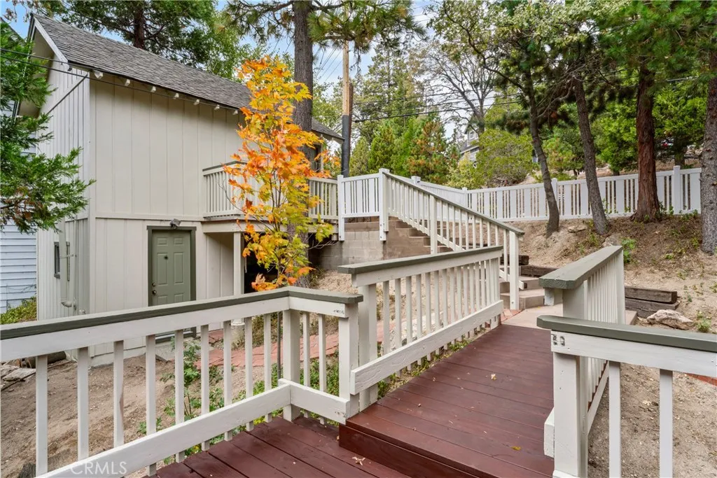 PROPERTY HIGHLIGHTS: This meticulously renovated cabin w/2 BD, 2 Full BA on two levels and THREE SCENIC DECKS (front, back and lower level). The cozy home’s entrance is set back well off the street. Street-LEVEL garage entry plus lighted concrete steps lead to a custom front door with vintage glass and A-Frame overhang.