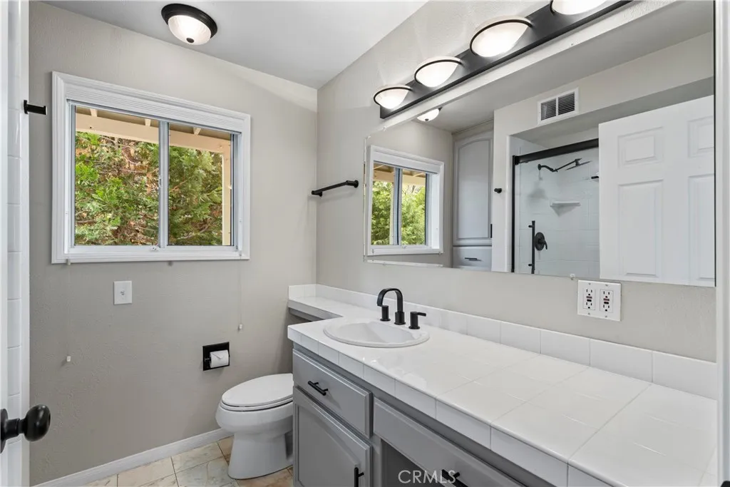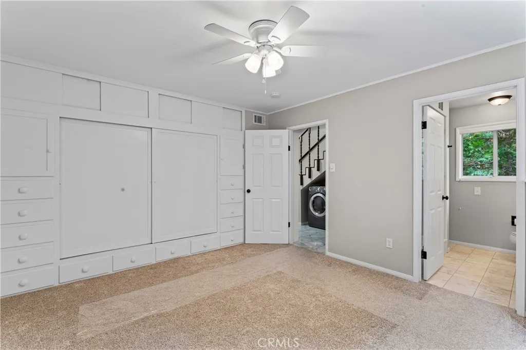 LOWER-LEVEL COMFORT: Two generously sized bedrooms with large windows and custom cabinetry are downstairs. One BD has wood wainscotting accents and is adjacent to the first large, gleaming full bath. The ensuite bedroom leads to deck with entrance to this level for easy backyard access.