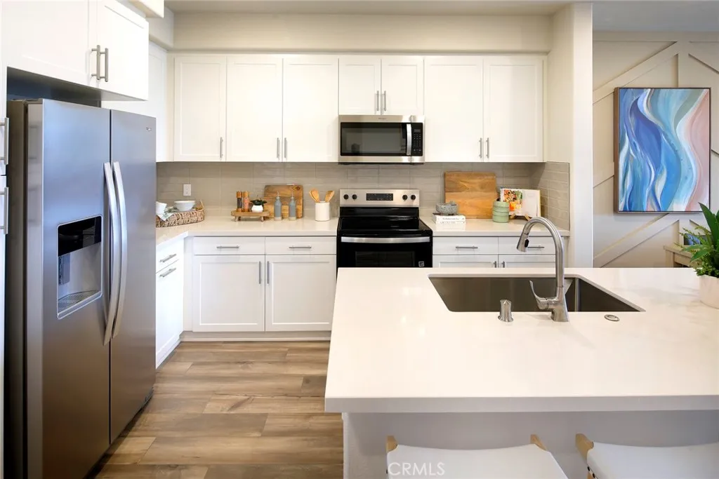 Welcome to Sagecrest by Century Communities! This beautiful Tri-level Gated townhome community is located in the heart of Riverside close by the 91 freeway right off Van Buren Blvd. very close to shopping, restaurants and California Baptist University as well as UC Riverside. After entering in from your private enclosed patio, heading up to the second floor you enter a spacious Kitchen with large island and dining area that has a private balcony off Livingroom. The kitchen features ” Prelude White” cabinets, quartz counters and back-splash. The second level also includes a bedroom and full bathroom. Going up to the third level you will find an Owner’s Suite which includes bathroom with double sinks, walk-in shower and walk-in closet. Finishing the 3rd level there’s an additional bedroom with its own private full bathroom and walk-in closet. Laundry room is also conveniently located on third level. Come see this amazing community in person, Sagecrest is a Gated Community and will include a playground, dog park, shade structures and BBQs and more!