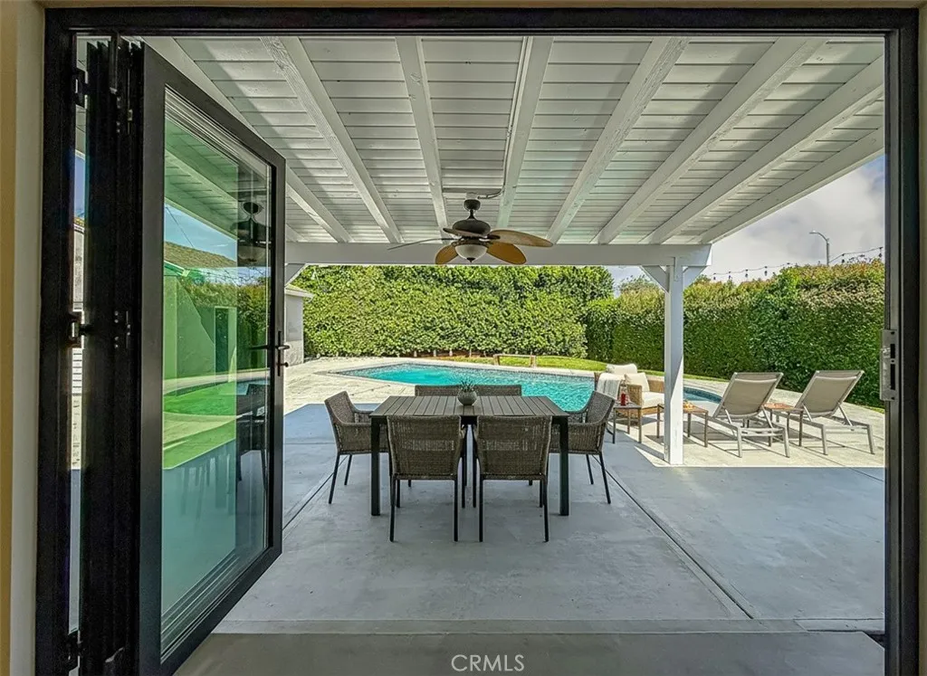 The backyard is a private retreat designed for relaxation and fun, complete with a sparkling pool, covered patio, and lush landscaping—ideal for hosting gatherings or unwinding in your own oasis.