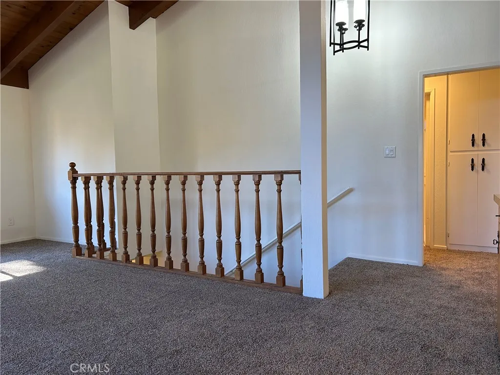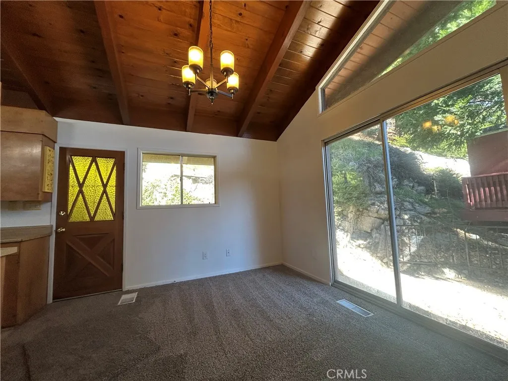BRAND NEW CARPET, FRESH NEW INTERIOR PAINT, & BRAND-NEW STAINLESS KITCHEN APPLIANCES on order…This charming home features level entry and stunning cathedral wood ceilings, offering 4 bedrooms and 2 baths, plus a 2-car garage with a large, heated workshop and extra parking. Fresh paint and new carpet make it move-in ready. The entry level has two bedrooms and a 3/4 bath, one with its own outdoor access. Upstairs, you’ll find two primary bedrooms with a full bath. The property includes RV or boat parking, a spacious laundry room, and a walk-in pantry. The upper floor boasts tall knotty pine ceilings throughout the bedrooms and expansive living room, a roomy kitchen with ample cabinets and counter space, and a formal dining area opening to a patio. Enjoy the floor-to-ceiling brick fireplace, a wraparound front deck, and a concrete rear patio perfect for play. Forced air heating. This commuter-friendly home is just minutes from schools, Lake Gregory recreation, fishing, and hiking. Experience a peaceful mountain lifestyle with four seasons, away from city noise and traffic, in a neighborhood with a private setting, set back from the main road.