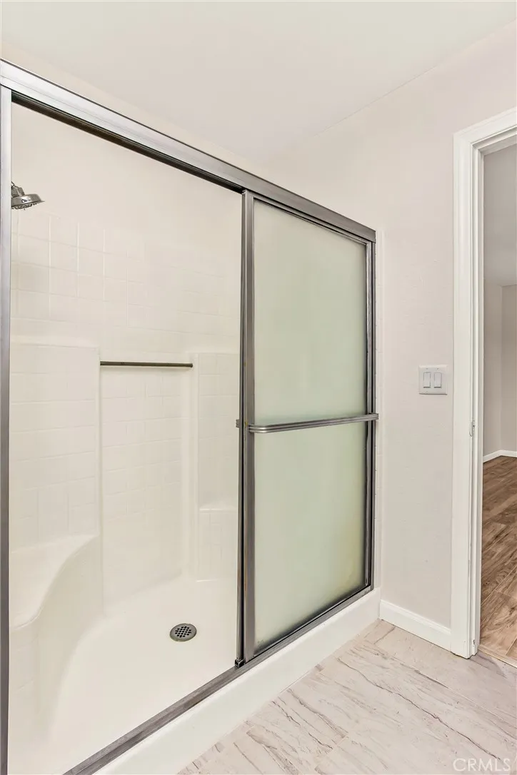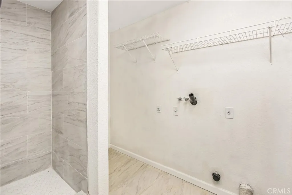 Attached ADU (converted garage) includes its own separate entrance, kitchen area with sink, spacious living area, two bedrooms with ceiling fans, full bath with tiled walk-in shower, and laundry hookups.