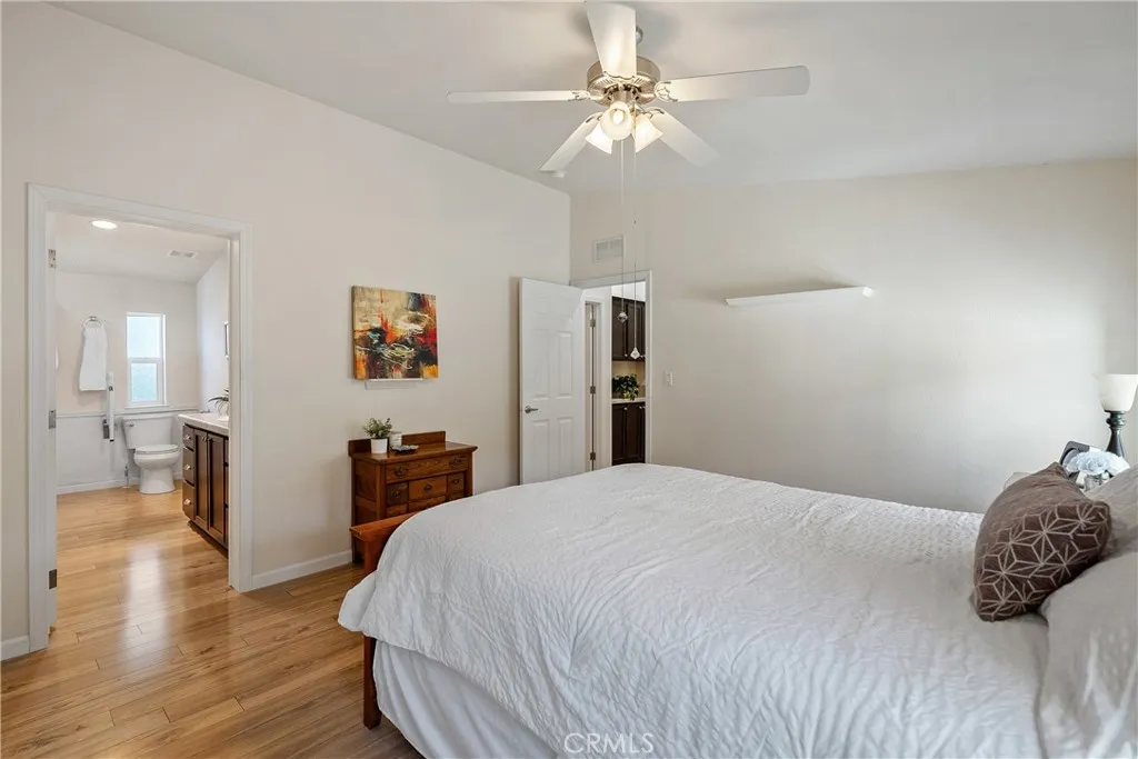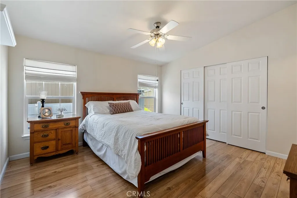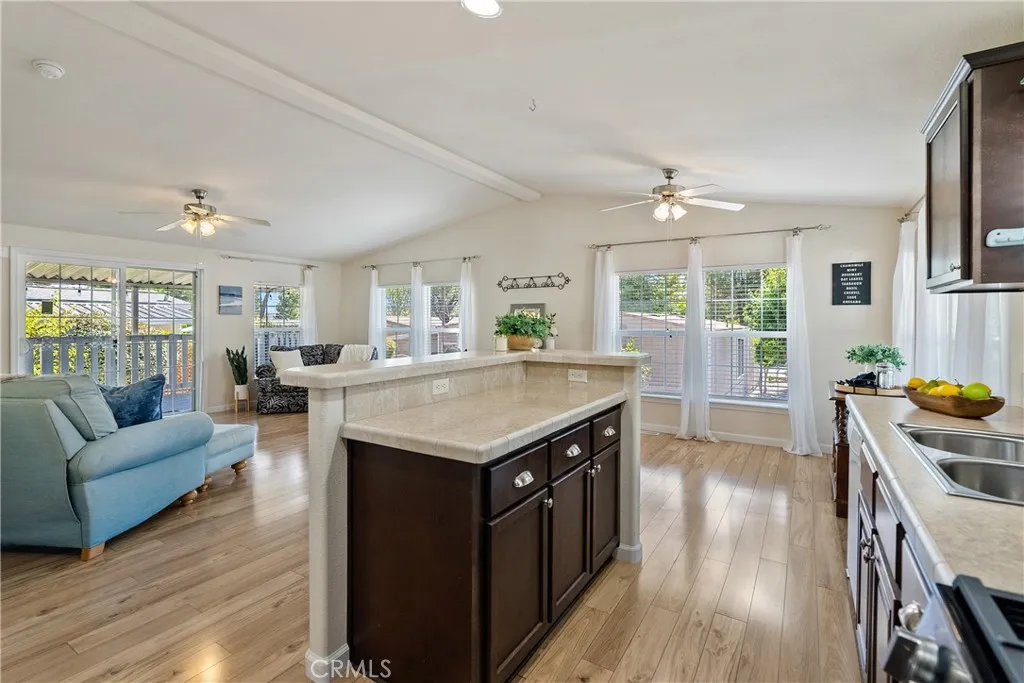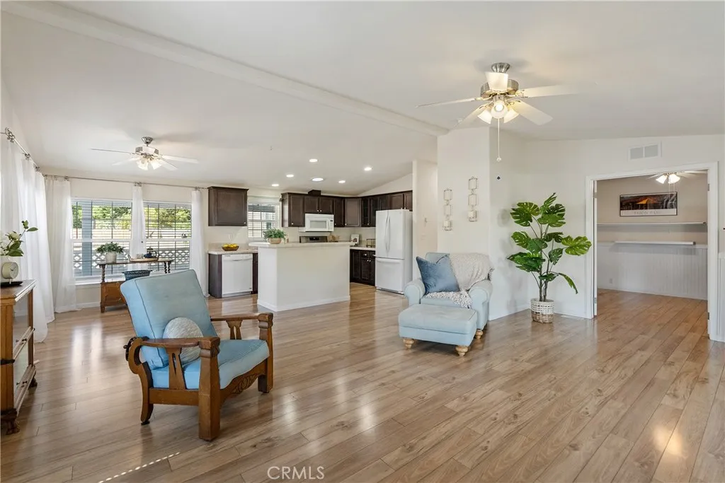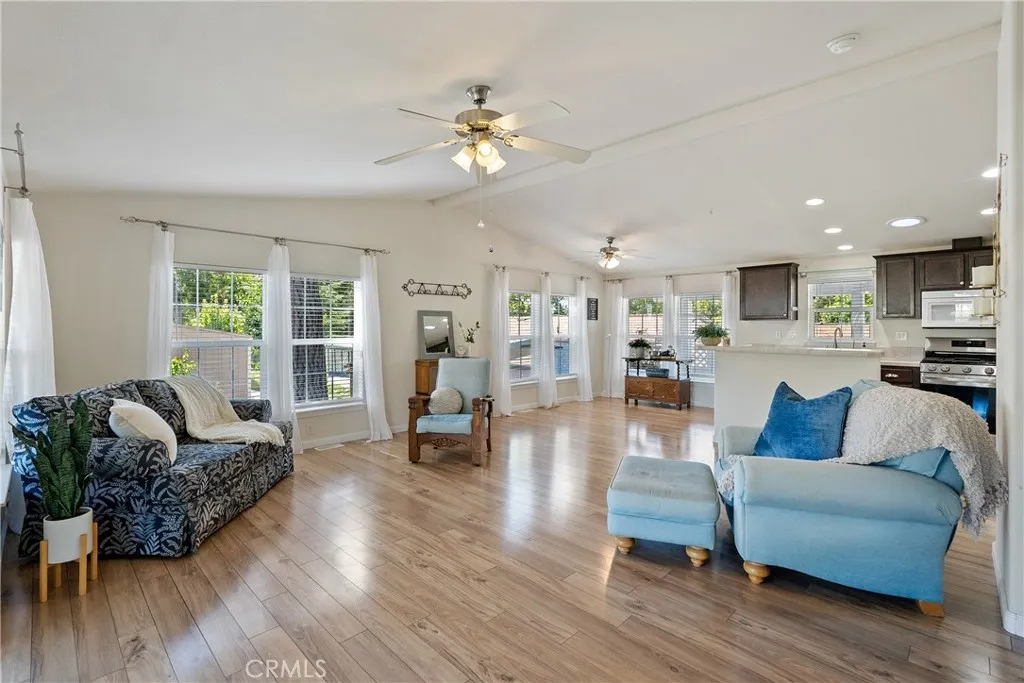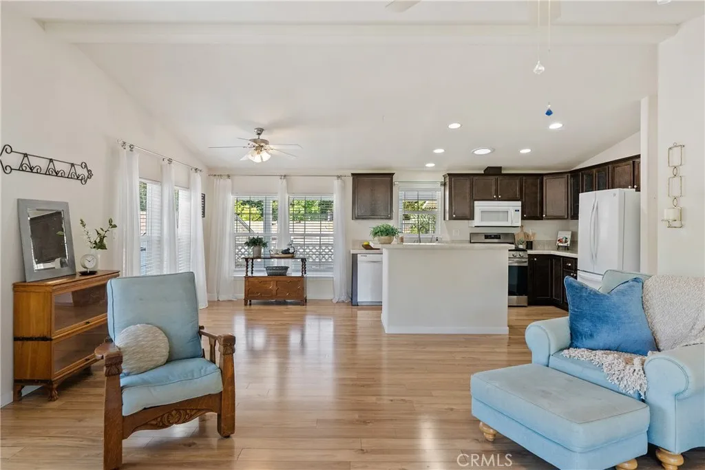 Welcome to this beautifully maintained 2-bedroom, 2-bath home with an office, offering comfort, style, and convenience in the desirable Rancho Paso 55+ community. Step inside to find abundant natural light streaming through windows and skytubes, highlighting the stunning white oak floors that flow throughout. The upgraded kitchen features rich coffee-colored cabinets, blending functionality with warmth. Enjoy the outdoors on the spacious deck nestled beneath a mature oak tree, or relax in the fenced yard enhanced by elegant gray cobblestone pavers and thoughtfully placed landscaping. A covered two-car carport adds everyday convenience. Rancho Paso offers a welcoming lifestyle with community amenities including a swimming pool and clubhouse. Move-in ready, this home combines modern upgrades with serene surroundings—perfect for those seeking comfort and community.
