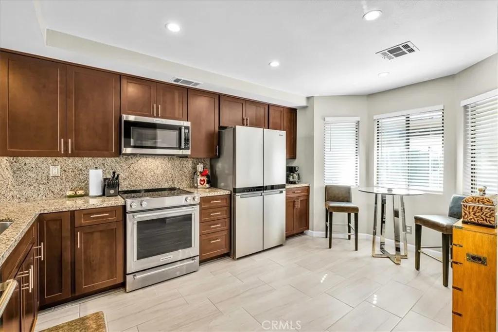 This home offers an expansive patio, where you can unwind or entertain while taking in sweeping views of the manicured golf course, sparkling water feature, and distant mountain peaks. The open kitchen with breakfast bar impresses with custom Shaker cabinetry, stainless steel appliances, and granite countertops. A striking stone accent wall in the living area adds warmth, texture, and architectural interest.Both bathrooms have been tastefully updated with stylish vanities and beautifully designed showers.