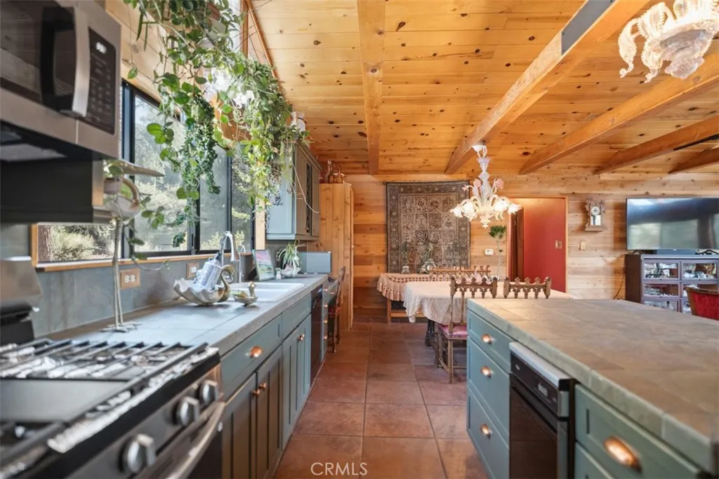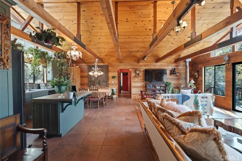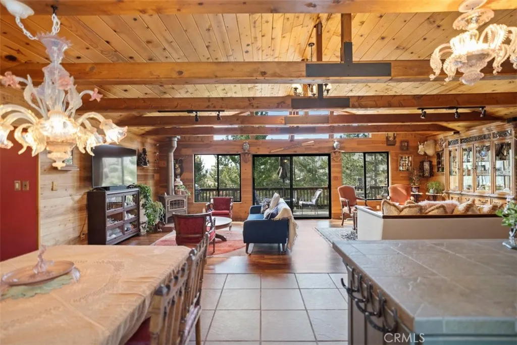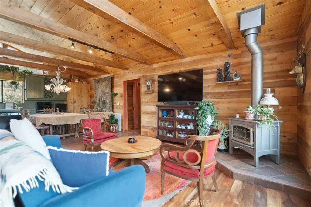Enter through the welcoming foyer into a spacious great room that captures the heart. Soaring wood-beamed ceilings and large windows frame stunning mountain views and vibrant sunsets, while a freshly cleaned wood-burning stove adds cozy warmth. New hardwood flooring (2024) flows throughout, tying the open-concept layout together with timeless elegance. The kitchen, open to the great room, features a large island for casual meals or lively gatherings, ample storage, and modern appliances. The adjacent dining area spills onto a spacious deck, expanding your living space into the crisp mountain air—perfect for morning coffee or evening stargazing.