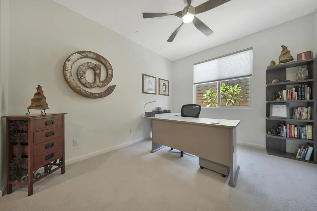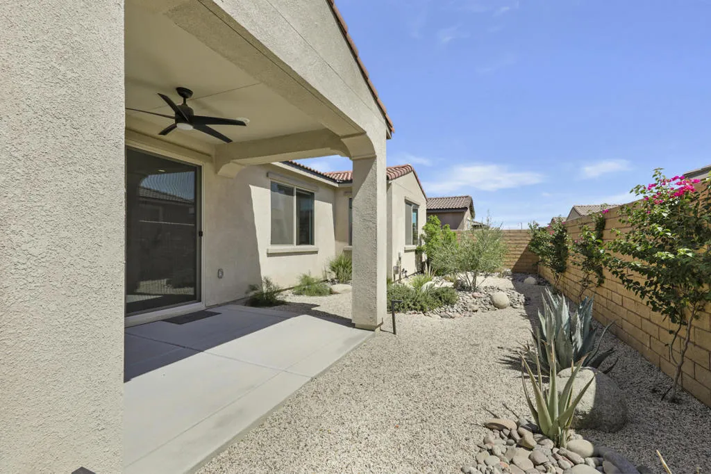 Innovative and Contemporary, this Comfortable Modern Design Features High Ceilings, Open Floor Plan, Light Porcelain Tile Floors, and Immaculate White Cabinetry and Countertops throughout. Gourmet Kitchen with Spacious Countertops, Upgraded Whirlpool Stainless Appliances, Island with Bar Seating and Pantry. Primary Bedroom with En-Suite Bath and Luxurious Oversized Walk-In Closet. Secondary Guest Room Privately Located away from Primary. This Popular Silver Creek Plan also features a Generous Sized Office which could easily be made into a Third Bedroom. Surround Sound and Motorized Shades in Great Room. Glass Sliders Open Great Room/Dining/Kitchen to Covered Patio–Perfect for Indoor Outdoor Entertaining with Family and Friends. Professionally Designed Backyard Landscape with Lighting and Irrigation. Owned Solar Panels. So many upgrades and Move-in Ready! Seize the Day and get into the Fun that this Community has to offer! Community Club House, Pool, Spa, Fitness, Pickle Ball and Bocce Court! Furnishings Negotiable outside of Escrow.