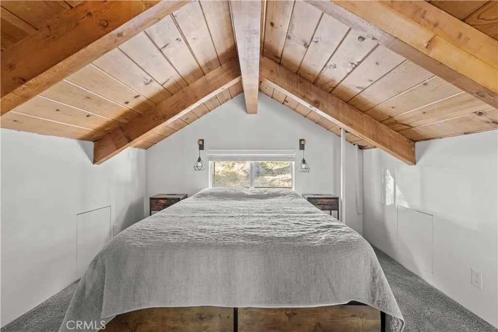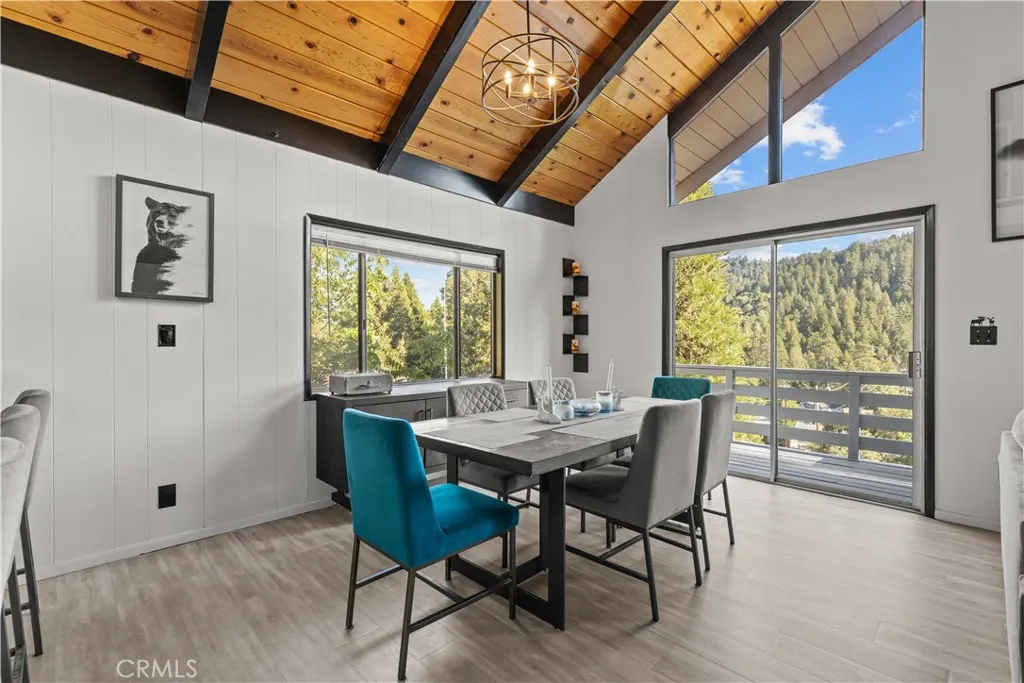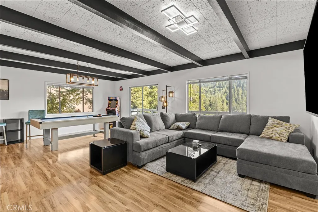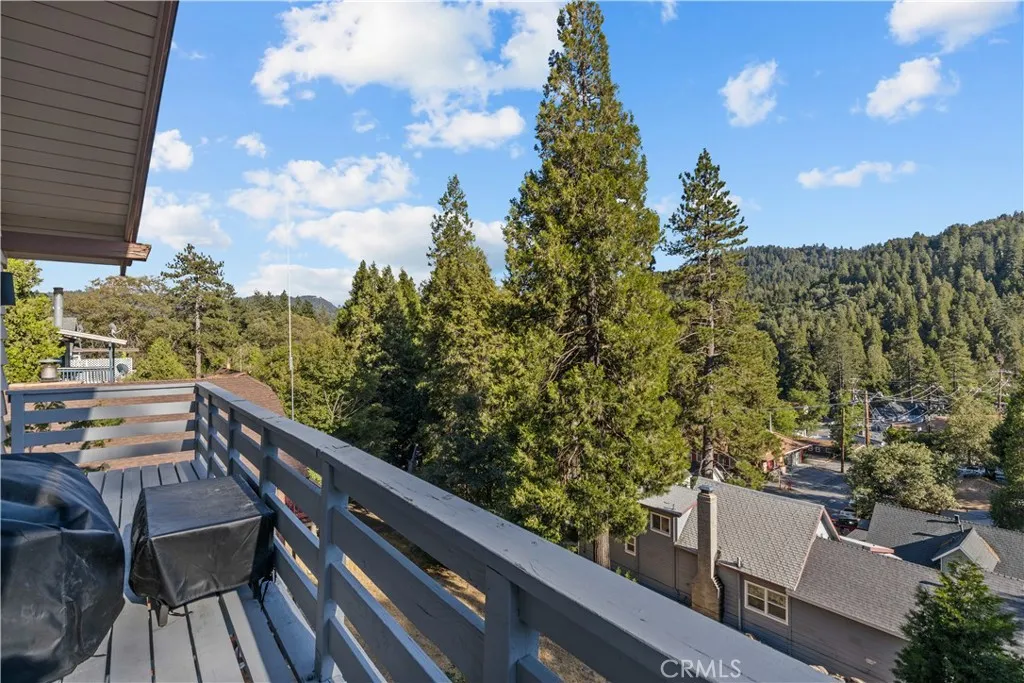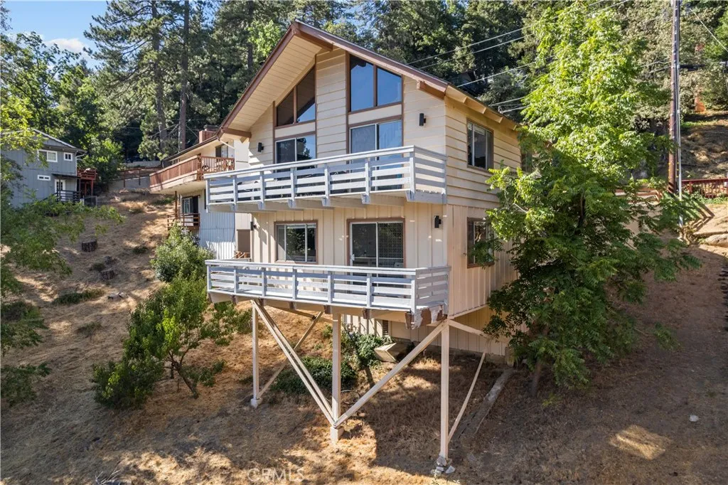 Escape to this inviting mountain cabin, perfectly tucked away in the trees. With a level entry and a desirable orientation with a downtown Crestline view that brings in natural light throughout the day, the open floor plan showcases exposed beam ceilings and expansive picture windows that frame peaceful pine views. The main level flows seamlessly with a spacious kitchen, dining area, and cozy living room anchored by a wood burning fireplace. Upstairs, a loft provides extra sleeping space with a closet, while the lower level features a private primary suite with a full size bath and a family room for relaxing or entertaining. Step outside to two decks that are perfect for morning coffee or evening sunsets. A hidden hatch leads to the laundry area beneath the home, keeping chores discreet and out of the way. Pride of ownership is evident throughout. With fruit trees on the property and just minutes from Lake Gregory, this home offers the perfect blend of comfort, privacy, and convenience, whether you are planning weekend getaways or full time mountain living. Set your move-in style: purchase the home furnished or bring your own.. furnishings are negotiable.