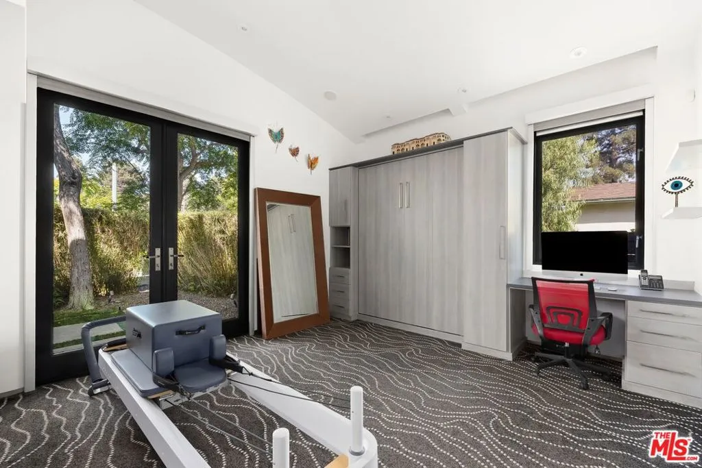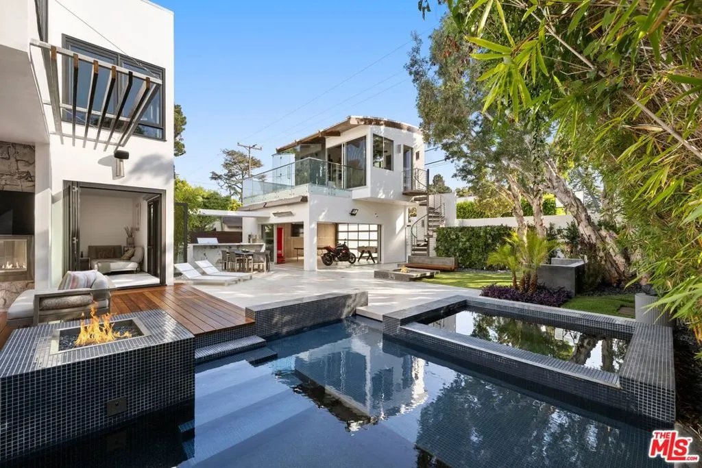 Concealed from the street by lush landscaping and mature trees, this exquisite contemporary entertainer’s compound offers a variety of modern amenities and a private, zen lifestyle in a coveted North of Montana neighborhood. Guests arrive past a variety of plantings, art pieces, and calming water feature, unaware of the many surprises that await. Inside, floor-to-ceiling picture windows and sliding glass invite natural light into the formal living room with its lofty double-height ceilings, exposed wood beams, dramatic staircase, and wet bar. A pocket door retreats to provide seamless flow into the outdoor living room with built-in heating, decorative fireplace, and fire pit adjacent to the sparkling black-bottom pool and spa. Designed with quintessential California living top of mind, the nearby formal dining room also opens to the home’s peaceful bamboo-lined grounds. The custom Italian chef-grade kitchen is complete with state-of-the-art appliances including Wolf range with pot filler and Miele warming drawer as well as a retractable flat screen and waterfall island. The adjacent family room also opens to the outside and features a massive 115-inch TV. The primary suite includes a large Vegas hotel-inspired bathroom with two large vanities, steam shower, and jetted tub plus an en-suite office. Secondary bedrooms and bathrooms are light-filled and have modern finishes. In the backyard, discover a spectacular two-story converted garage that can house vehicles or be used as a rec room, billiards, and more. On its second level is a gym, yoga, or artist’s studio plus rainwater shower and an oversized glass-encased steam room. There is also a built-in barbecue and outdoor dining, a large amount of patio space, and a sitting area with a second fire pit for evening conversation. Welcome to this prime location near the Brentwood Country Club and Country Mart, just moments to the area’s top-rated restaurants, schools, parks, golf courses, shopping, and world-class beaches.