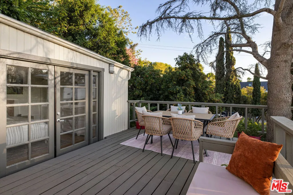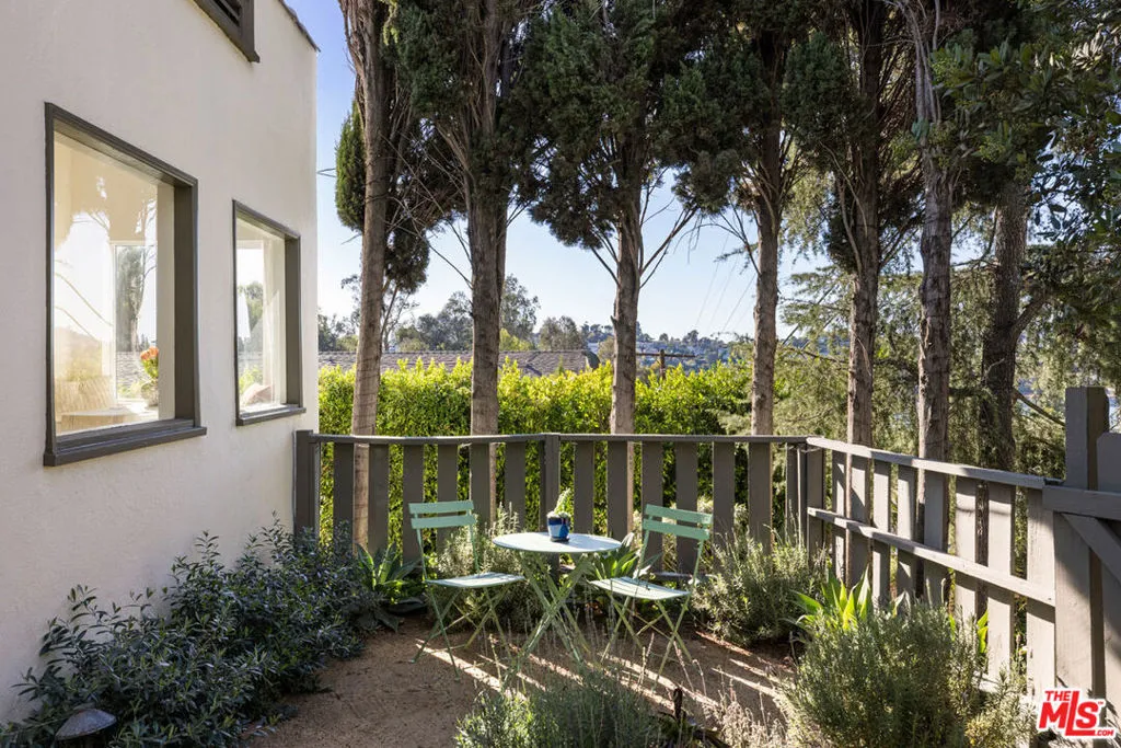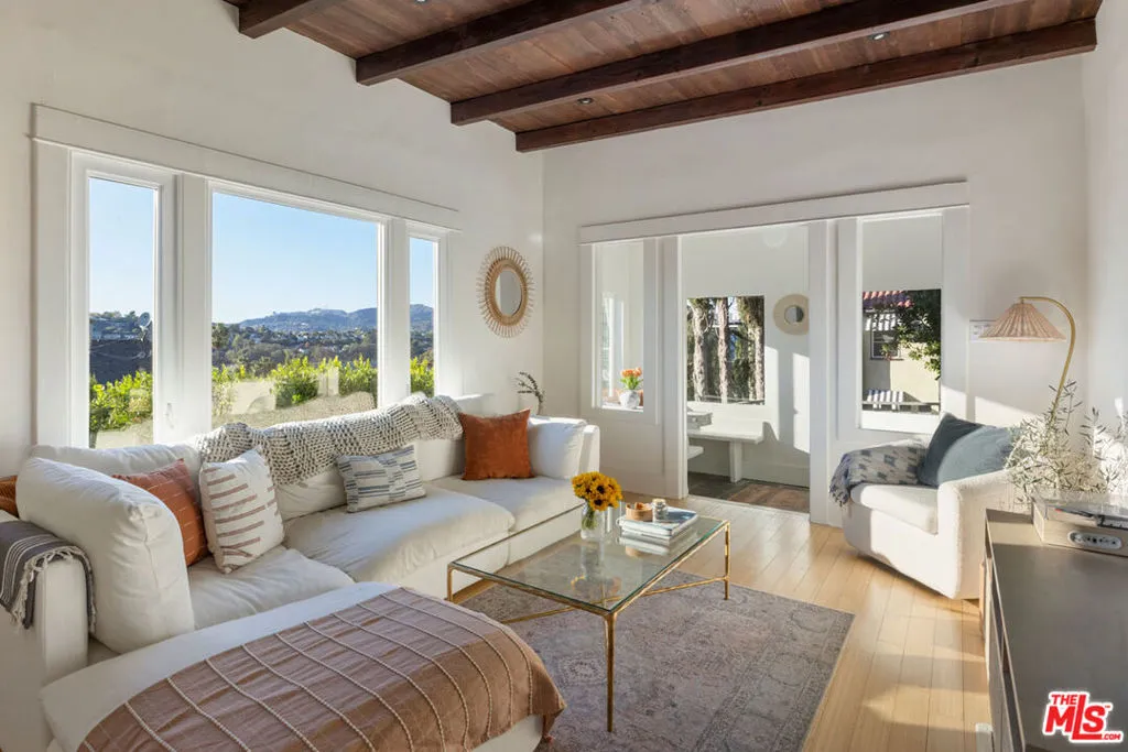 Set back from the street in prime Silver Lake, this 1923 Spanish enjoys privacy and sweeping views just moments from the Reservoir. The layout feels bright and open with beamed ceilings, hardwood floors, and large picture windows framing scenic vistas of the Griffith Observatory and Hollywood Sign. The airy kitchen provides generous storage and a breakfast bar for casual meals, and flow is easy a spacious deck, a dreamy setting for morning coffee, or dinner under the stars. Three bedrooms offer flexibility for a den or home office. The fenced front yard is landscaped with native plants and includes a built-in bench, a quiet spot to read or unwind. Amenities include HVAC, laundry, and ample driveway parking. From this hillside perch, you’re close to the Reservoir and Meadow, Whole Foods, Friends & Family, Silver Lake Wine, Red Lion, and more.