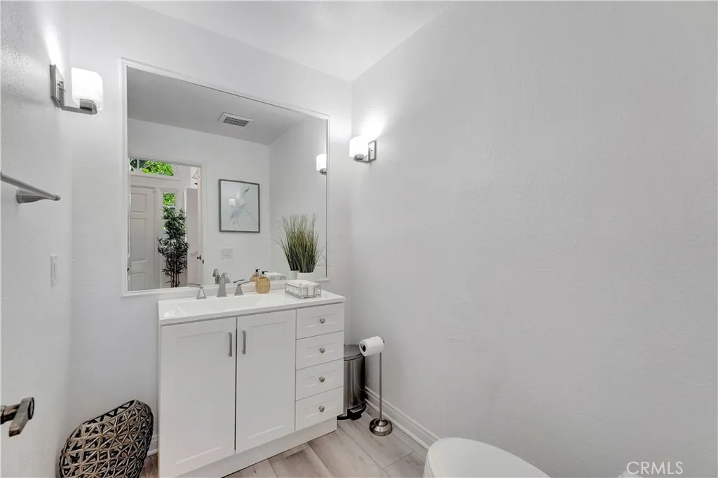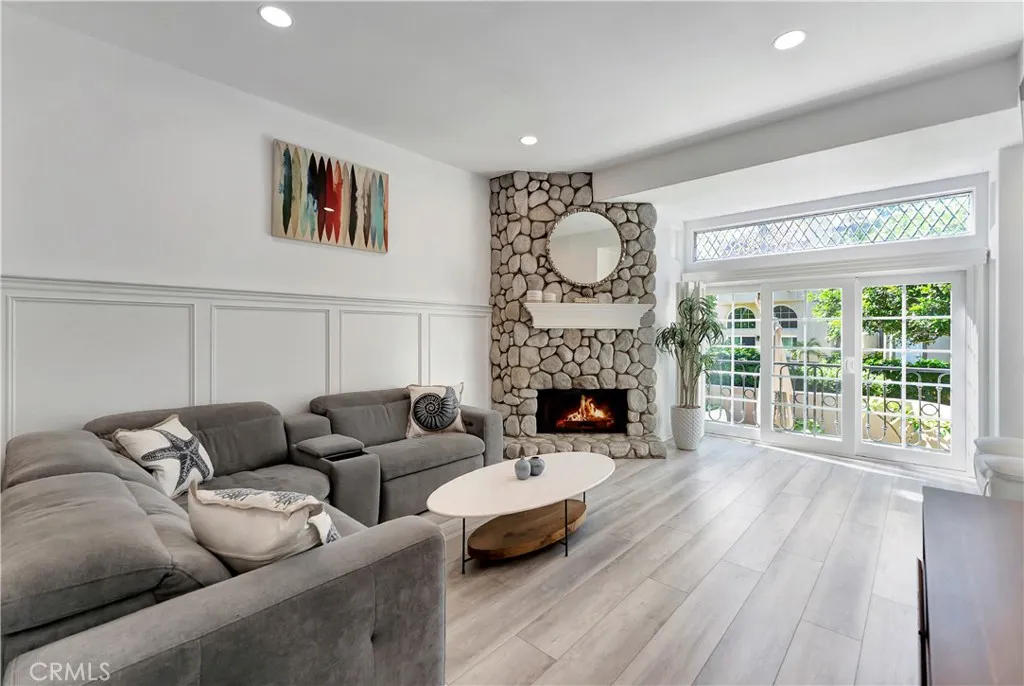 Extremely light & bright ocean-close home in a fabulous interior location facing a serene greenbelt in SeaCliff on the Greens – the exclusive 24-hour guard gated community that is a 5-minute walk to the beach and across the street from the wetlands! Upgrades include recessed lighting, upgraded hard surface flooring, brand new AC, custom paint, custom light fixtures, plantation shutters, updated windows and sliders and so much more. The living room showcases a floor-to-ceiling stone fireplace and custom windows & slider. Just off the kitchen, a cozy family room with a built-in desk opens to a partially enclosed balcony for added space, and another balcony next to the kitchen is perfect for your BBQ setup. Gourmet kitchen with stunning waterfall quartz counters, white shaker cabinets, breakfast bar, and stainless steel appliances. Grand primary suite with vaulted ceilings, dual walk-in closets with organizers & view balcony. The primary bath has been tastefully remodeled with shaker cabinets, quartz counters, dual sinks, a spa tub, and a walk-in shower. Ample size secondary bedrooms and conveniently located upstairs laundry area. Direct garage access with tons of storage. Beautiful sunny front patio with newly installed pavers facing the greenbelt. 2-minute walk to several community pools, spas, and clubhouse. Steps to the beach, the trails at the Bolsa Chica Wetlands and fabulous parks. Award-winning SeaCliff Elementary School. A truly unique community!