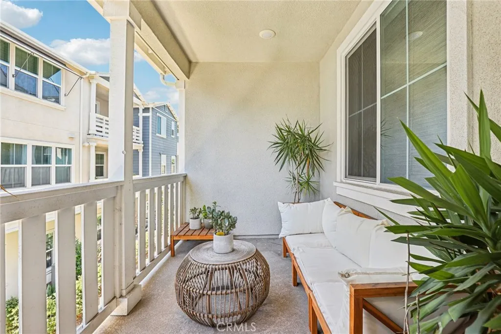 The kitchen stands out with sleek quartz counters, a large island, and stainless steel appliances including a gas range, refrigerator, microwave, and dishwasher. A walk-in pantry adds everyday convenience and ample storage. A private balcony captures views of the courtyard, perfect for a morning coffee or unwinding at sunset.