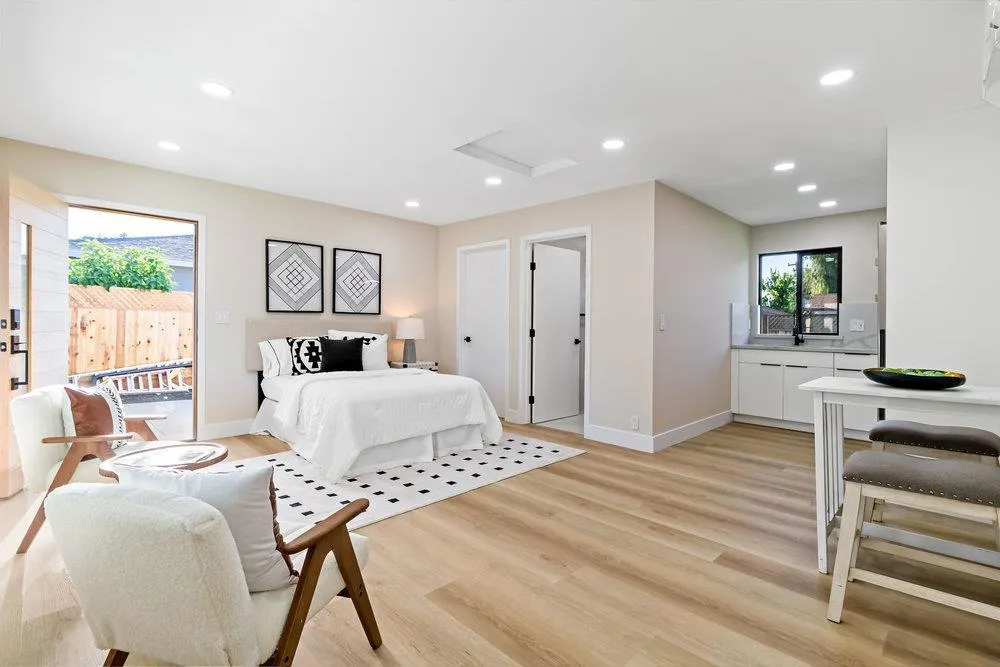Beautiful and Expensive 4 bedrooms, 2 full bathrooms, The Private Master Suite Could be used as an ADU (All Permitted) with separate entrance and separate Kitchen. Connecting doors for private master suite, guest quarters, or rental. This 1,468 sq ft residence sits on a generous 6,420 sq ft lot, offering both indoor comfort and outdoor space for entertaining or expansion. The seller invested over $500K+ in renovation, new Electrical wiring, replumbing, new Black on Black Milgard windows, new roof with 4 Skylights and new brand new landscape & hardscape. Recent renovations also include new flooring, new European style kitchen cabinets with quartz countertops and stainless steel appliances, modern bathrooms, New private Electric gate for driveway. Open floor plan with abundant natural light and spacious living areas. Conveniently located near Valley Fair, Santana Row, Santa Clara Valley Medical center, O’Connor Hospital, San Jose City College, major freeways, and local schools. A rare turnkey opportunity with flexible living options!