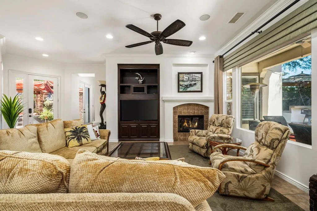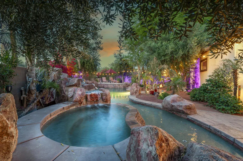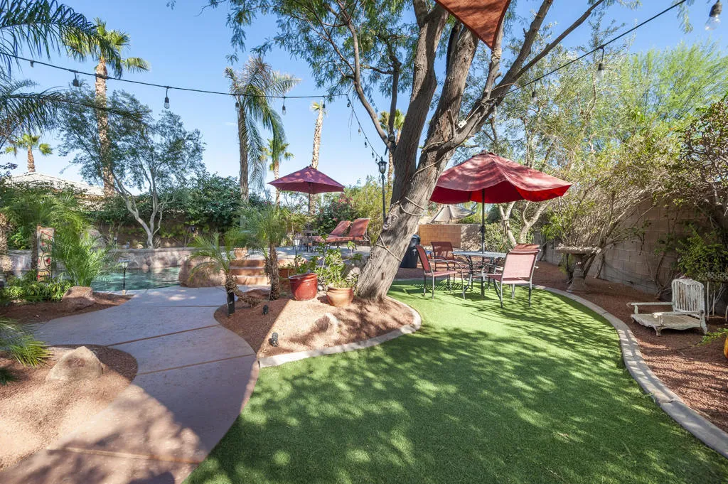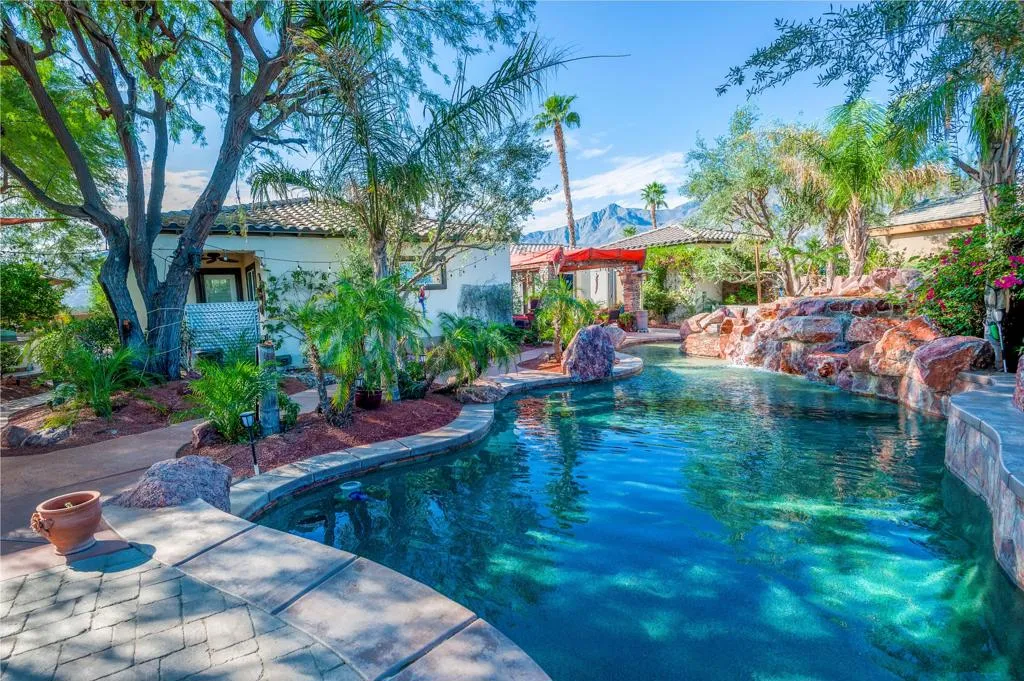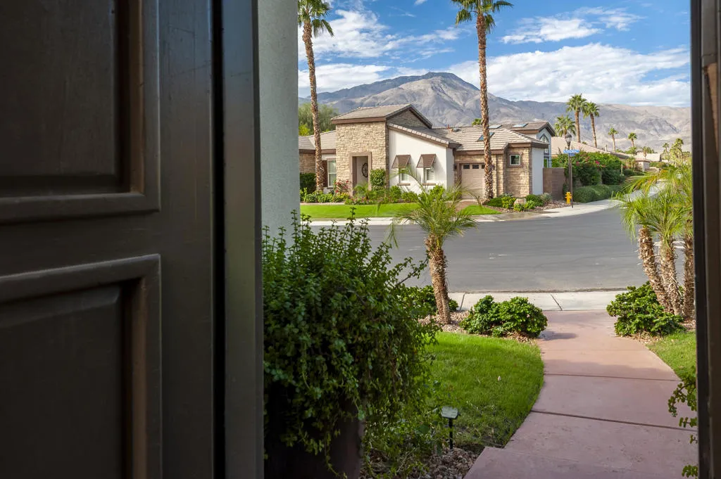 Once upon a time is the way this storied Trilogy at La Quinta property begins. An adult playground of grand scale hidden behind a tall wooden door is a home purposefully designed for the joy of living large. At 2,789 SQ FT, this rare four-bedroom, four-baths Mesquite model home with two-car and separate single car garages, has at its center a large private courtyard with separate doors to the main home, a detached Casita with kitchenette and full bath, and a separate attached Casita, also with a full bath. The exquisite primary bedroom retreat has direct access to the courtyard, and to a private covered back patio. The double-door entry, tray ceiling and room size is outstanding, but the highpoint is a sumptuous bath featuring two separate vanity stations covered in marble and each with walk-in closets, a king-size marble shower with two shower heads and bench seat, and a dreamy soaking tub. Inside, the home is open with ten-foot ceilings, crown molding and tile floors in the main living areas. The great room has custom built-ins, and TV with surround sound in the ceiling and a gas-log fireplace to curl up by while reading or binge watching your favorite shows. The kitchen is outfitted with premium stainless steel appliances, six-burner cooktop, double-oven, and dishwasher. A center island with pendant lighting, abundant cabinetry, built-in pantry and smooth granite slab countertops with stone backsplash makes cooking pure joy. Special occasions call for a formal dining room, and this one is spacious and inviting. The large office area with wine-storage is also usable as a flex space for crafts, wine-room, cafe or anything else your heart desires. The expansive courtyard has seating for large gatherings, and the beautifully crafted pergola adds a filtered cover for year-round comfort. Come fall and winter everyone will enjoy gathering around the raised gas lava-stone firepit while cheering on their favorite teams on the outdoor big screen TV. On warm days, life outside stays comfortable with a Kool Fog misting system that envelops much of the home’s exterior in a fine cooling mist. Adjacent to the courtyard, surrounded by exquisite pygmy palms and tropical flora, is a spectacular resort-style Pebble-Tec salt water pool with towering rock waterfalls cascading over three-tiers into the spa and pool below. At the far end of the pool is a raised deck to relax and take in the views, or as a stage to dance the night away.