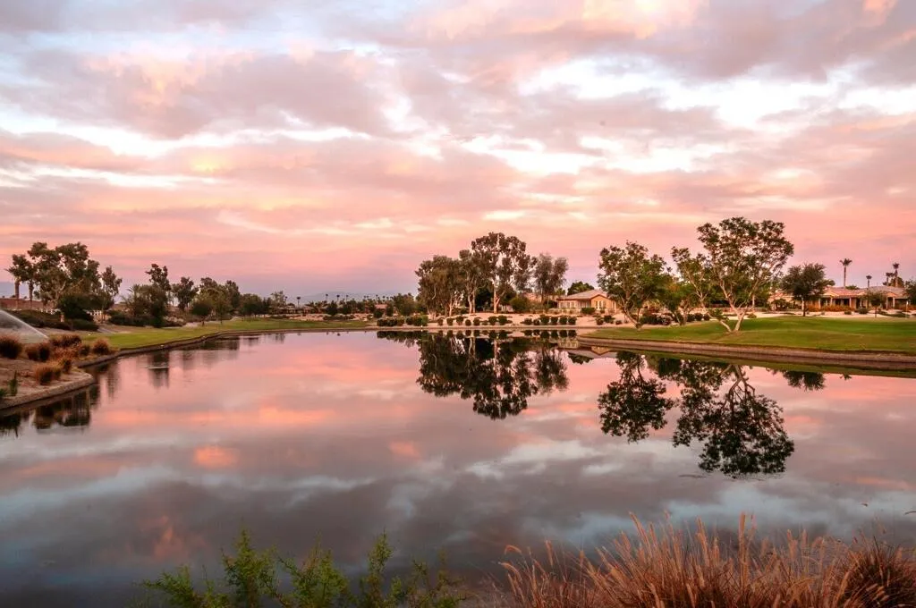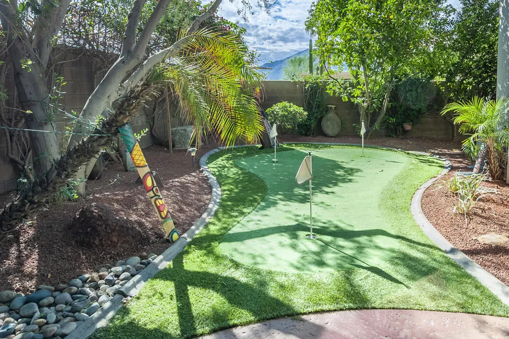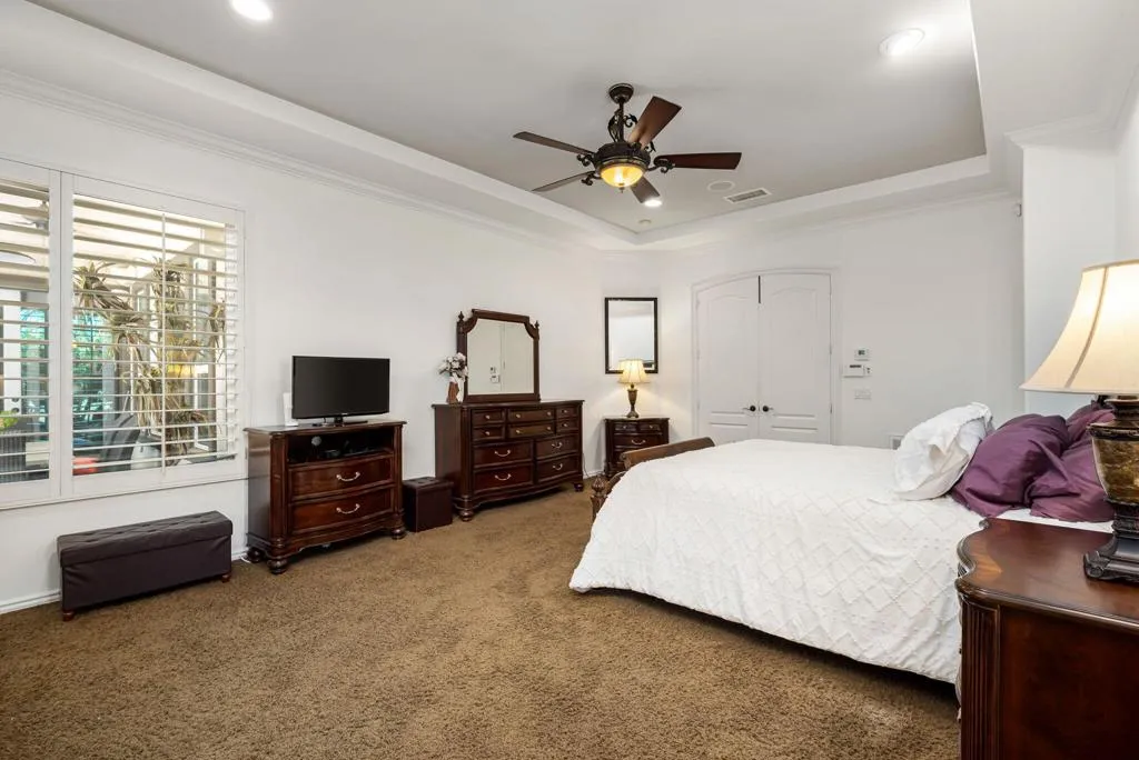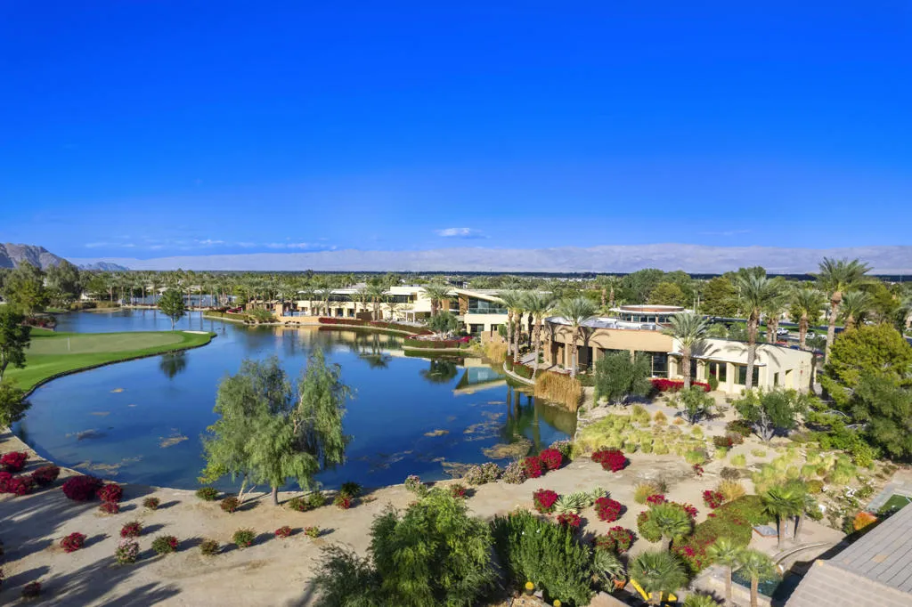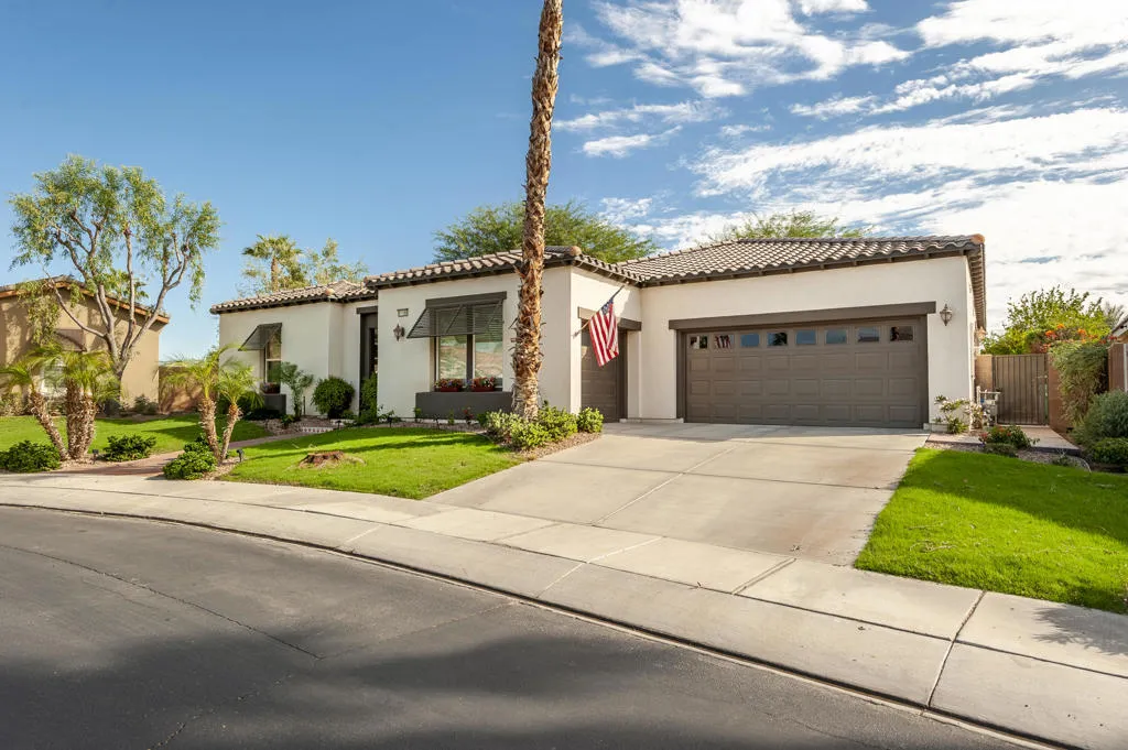 Once upon a time is the way this storied Trilogy at La Quinta property begins. An adult playground of grand scale hidden behind a tall wooden door is a home purposefully designed for the joy of living large. At 2,789 SQ FT, this rare four-bedroom, four-baths Mesquite model home with two-car and separate single car garages, has at its center a large private courtyard with separate doors to the main home, a detached Casita with kitchenette and full bath, and a separate attached Casita, also with a full bath. The exquisite primary bedroom retreat has direct access to the courtyard, and to a private covered back patio. The double-door entry, tray ceiling and room size is outstanding, but the highpoint is a sumptuous bath featuring two separate vanity stations covered in marble and each with walk-in closets, a king-size marble shower with two shower heads and bench seat, and a dreamy soaking tub. Inside, the home is open with ten-foot ceilings, crown molding and tile floors in the main living areas. The great room has custom built-ins, and TV with surround sound in the ceiling and a gas-log fireplace to curl up by while reading or binge watching your favorite shows. The kitchen is outfitted with premium stainless steel appliances, six-burner cooktop, double-oven, and dishwasher. A center island with pendant lighting, abundant cabinetry, built-in pantry and smooth granite slab countertops with stone backsplash makes cooking pure joy. Special occasions call for a formal dining room, and this one is spacious and inviting. The large office area with wine-storage is also usable as a flex space for crafts, wine-room, cafe or anything else your heart desires. The expansive courtyard has seating for large gatherings, and the beautifully crafted pergola adds a filtered cover for year-round comfort. Come fall and winter everyone will enjoy gathering around the raised gas lava-stone firepit while cheering on their favorite teams on the outdoor big screen TV. On warm days, life outside stays comfortable with a Kool Fog misting system that envelops much of the home’s exterior in a fine cooling mist. Adjacent to the courtyard, surrounded by exquisite pygmy palms and tropical flora, is a spectacular resort-style Pebble-Tec salt water pool with towering rock waterfalls cascading over three-tiers into the spa and pool below. At the far end of the pool is a raised deck to relax and take in the views, or as a stage to dance the night away.