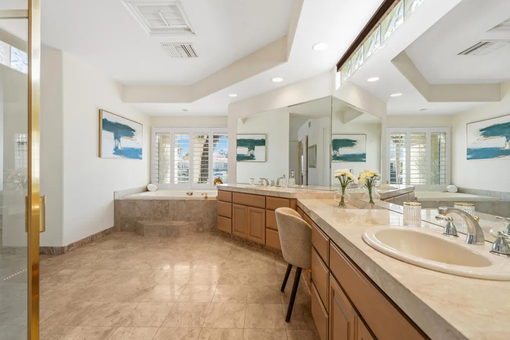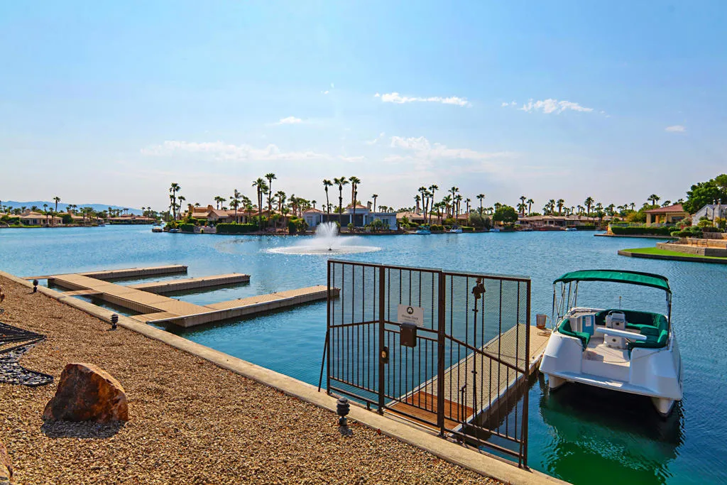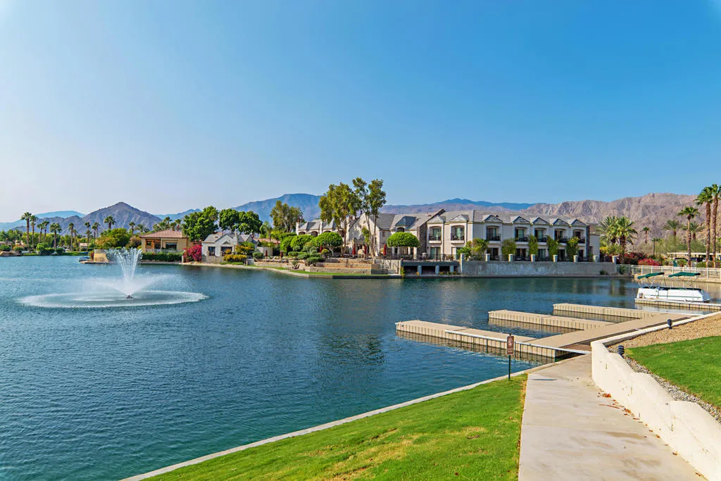 Discover the rare magic of lakefront living surrounded by desert beauty. This 3-bedroom, 3-bath custom home is one of 110 homes on the lake in the gated community of Lake La Quinta perfectly blends elegance, comfort, and resort-style relaxation.Step through a custom entryway and into a bright, open great room framing breathtaking views of a 26-acre private lake and its glistening water feature. The high ceilings and indirect lighting create a luminous, airy atmosphere throughout the home.Designed for both entertaining and everyday luxury, the chef’s kitchen features slab granite countertops, travertine flooring and an adjacent wet bar–ideal for hosting friends and family. The seamless indoor-outdoor flow extends to an infinity pool with brilliant blue accent spa. Interlocking pavers connect to lakeside sitting areas where you can unwind, dine al fresco, or wave to neighbors who may pass by on their electric boats for a sunset cruise.The spacious primary suite offers direct access to the pool, spa, and private dock–a serene retreat with a soaking tub, double-sink vanity, separate shower, and a large walk-in closet. Each guest bedroom includes its own private bath, ensuring comfort and privacy for all.Beyond your home, enjoy exclusive community amenities–tennis, pickleball, bocce ball, a scenic park, BBQ pavilion, and a heated pool–all within a 24-hour guard-gated neighborhood offering unmatched peace of mind. A three-car garage with generous storage completes this stunning desert oasis. The 3rd car garage may be converted to an attached casita.Lakefront luxury. Desert serenity. Resort living every day. Make this extraordinary home your next chapter–schedule your private tour today!