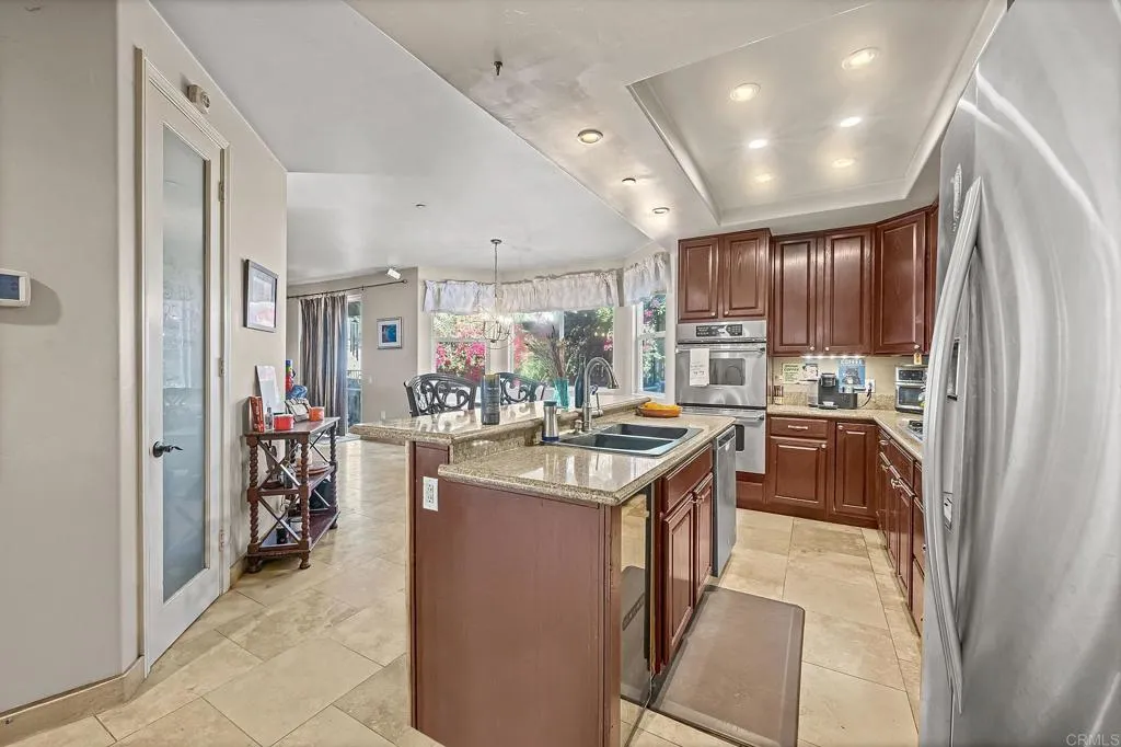 Spacious home on a large half-acre lot surrounded by sweeping mountain views! A long double driveway leads you to the entry, where soaring ceilings welcome you inside. The living room is warm and inviting with wood floors, a welcoming stone fireplace, and large windows that fill the space with natural light. From here, step into the dining room with travertine flooring and an elegant chandelier—perfect for gatherings. A versatile bonus room on the first floor makes an ideal playroom or home office. The heart of the home is the kitchen, featuring rich wood cabinetry, granite countertops, a walk-in pantry, double oven, and center island with bar seating. It connects seamlessly to a breakfast nook framed by bay windows and a spacious family room with a second fireplace and sliding doors to the backyard. Outside, the expansive lot offers a picnic area, firepit, and endless space for entertaining, gardening, and endless possibilities! A full bathroom is also located on the first floor, along with a full-size laundry room with plenty of storage and access to the oversized 4-car garage. Upstairs, a large skylit loft provides even more living space. The primary suite is a true retreat, complete with its own fireplace, sitting area, and a large private balcony to enjoy serene mountain views. The updated ensuite bathroom includes a soaking tub, walk-in shower, double sinks, and an enormous walk-in closet with boundless potential. Four additional large bedrooms and two more updated full bathrooms provide plenty of room for family and guests. Additional upgrades include custom ceiling fans, stylish light fixtures, and solar for energy efficiency. All in a great location close to schools, shopping, restaurants, and just 15 minutes from the beach!