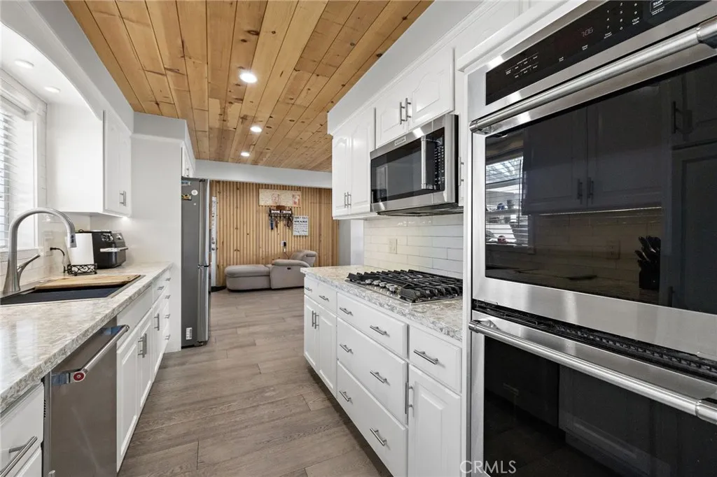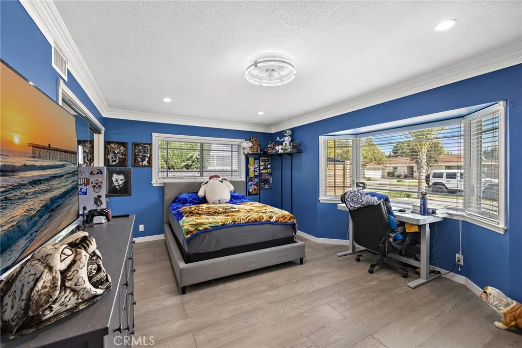 Beautiful single level ranch style home on a quiet cul-de-sac. This 3 bedroom, 2 bathroom home has the ability to easily add a 4th ensuite bedroom/bathroom (call for details). So many updates and luxuries throughout the home including bifolding doors from the great room to the backyard and new wood floors throughout. With the oversized driveway, a two car garage plus a workshop area and an additional 400 sq ft of storage above, the space is versatile for families, additional bedroom and bath, RV parking, etc. The kitchen features stainless steel appliances, 5 burner gas stove, double oven, and granite countertops. The dining room is open to the living room with a beautiful stone fireplace and a raised back deck overlooking the expansive yard. This open concept floor plan extends to the outdoors with the bifolding doors bringing the outside in. The private, large backyard features a covered brick patio for dining, a dog run and large lawn. Freshly painted on the interior and exterior, a new tankless water heater, state of the art bathroom, Milgard windows, whole house fan, fully owned solar panels are among the many features. Located close to Arena Sports Park, Super Range Golf, Chapman University, and within Villa Park High School zoning.