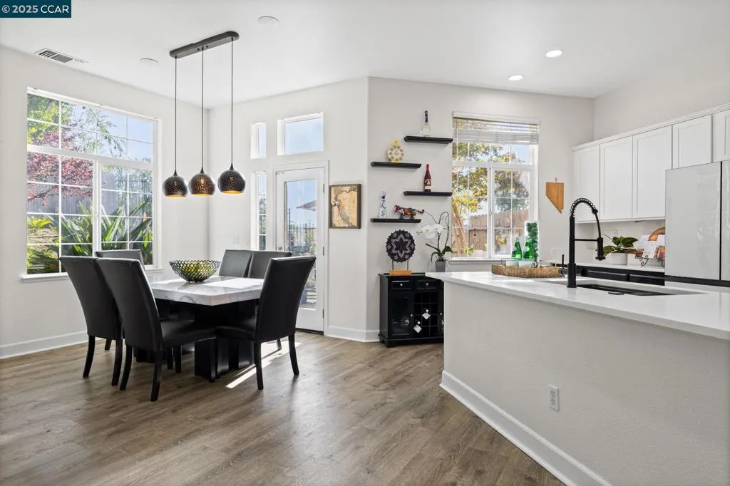 Set within the private, gated community of Tiara, this well-maintained home offers a blend of comfort, function, and flexibility. The open-concept main level features a spacious living and dining area with soaring ceilings that flow into a bright kitchen with timeless finishes, ample cabinetry, a gas range, and a large peninsula for casual dining. A full bedroom and bath on the main floor provide versatility for guests, extended family, or a home office. Upstairs, the primary suite offers a walk-in closet and a relaxing bath with dual vanities and a soaking tub. Two secondary bedrooms have been combined to create a large bonus suite but can easily be converted back to the original five-bedroom layout. The backyard feels like an extension of the living space, with a paved patio for dining, a level lawn for play, and lush, mature landscaping that creates color and privacy throughout the seasons. Open hillside views provide a serene backdrop. Residents of Tiara enjoy secure gated access, a playground, sports court, and picnic area, all minutes from Gateway Plaza shopping, dining, and the Vallejo Ferry Terminal for convenient commuting.