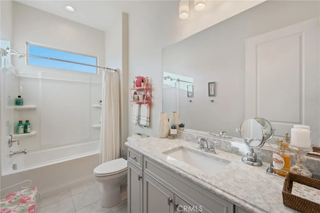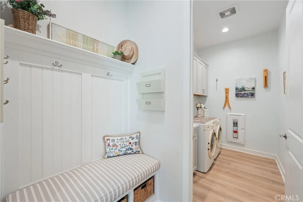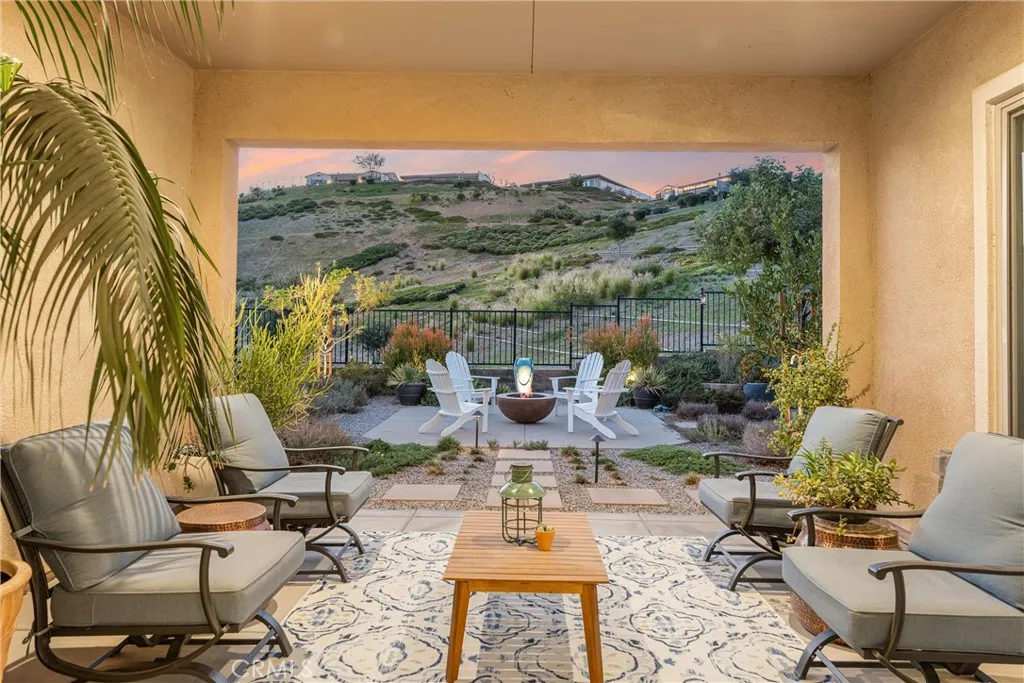 55+ RESORT-STYLE LUXURY LIVING | 1-STORY | PANORAMIC VIEWS | FULLY PAID SOLAR | GUARDED + GATED | Welcome to this beautifully upgraded home in the highly desired Terramor — where modern luxury and comfort meet in a vibrant community! A welcoming front patio with mountain views sets the stage for easy living in this elegant residence. Step inside to be greeted by abundant natural light, gorgeous luxury plank flooring, & an impressive array of upgrades. The open-concept Living Room has a warming fireplace & a 2-panel sliding glass door that extends your living space into the grand California Room & fully landscaped yard, creating the perfect blend of indoor-outdoor living. The chef-inspired Kitchen boasts stunning quartz countertops, breakfast bar seating, upgraded cabinetry, stainless steel appliances, pot & pan drawers, under-cabinet lighting, and oversized walk-in pantry. The Dining Room offers convenience for entertaining with a second slider to the backyard & a built-in china hutch with glass display doors—adding style & function. The Primary Ensuite Bedroom is spacious & filled with natural light, creating a serene retreat. The spa-like Ensuite Bathroom showcases quartz countertop, dual sinks, an oversized frameless shower with seating, upgraded cabinetry, & a walk-in closet with custom built-ins. Bedroom #2 enjoys stunning mountain views, while the Builder’s spacious optional Bedroom #3 is currently a combined office/den. Bathroom #2 includes quartz counters and a shower-tub combination. Additional highlights include a separate Laundry Room with extended cabinetry and utility sink, and a Mudroom featuring a custom upholstered bench and extra entry storage for convenience. Step outside to your private backyard retreat, complete with a covered California Room, firepit with dedicated gas line, gazebo-covered dining area, a 2nd gas line for your BBQ, an oh-so-perfect lavender garden, and captivating sunset panoramic views. Energy efficiency is top-of-the-line with fully paid solar system, EV outlet, tankless water heater, whole house fan, drip irrigation & recessed lighting. Amenities include 2 clubhouses (55+ Only and All Ages), indoor & outdoor pools, fitness center, wellness studio, tennis, pickleball, miles of trails, dog parks & sports fields. Nearby find shopping, restaurants, cinemas & quick access to OC via 15/91 Expressways & 241 Toll. This remarkable residence offers the perfect blend of elegance, privacy, & modern comfort — welcome home!