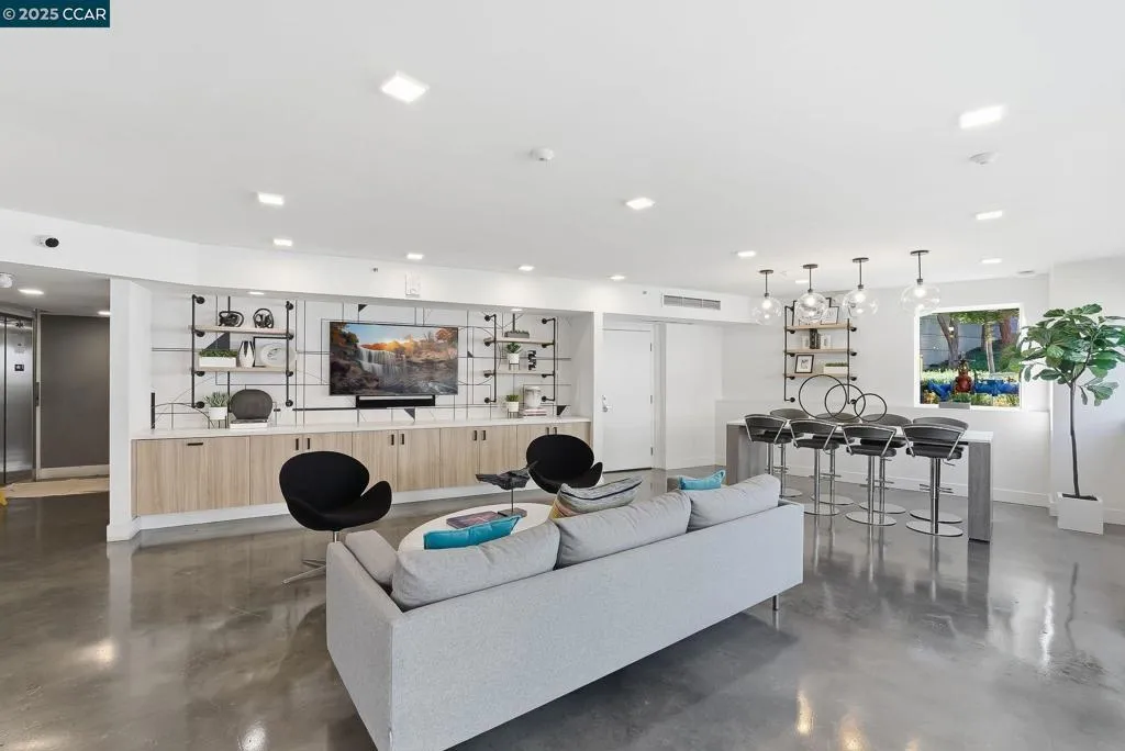 Nestled in the heart of downtown Walnut Creek, this bright and modern 1,074 sq ft, 2-bedroom, 2-bath home at The Riv offers the perfect blend of style, comfort, and convenience. With contemporary finishes and a thoughtful open layout, it’s designed for easy living in one of Walnut Creek’s most desirable locations. Step inside to soaring floor-to-ceiling windows, hardwood flooring, and abundant natural light that fills every corner. The European-inspired kitchen features sleek cabinetry, quartz countertops, a spacious island, and stainless-steel appliances—seamlessly connecting to the open living area and south-facing balcony with peaceful, tree-lined views. The primary suite offers balcony access, generous closet space, and a beautifully updated bath, while a convenient office nook sits just outside the secondary bedroom—ideal for remote work or study. Additional highlights include two deeded garage spaces, an extra storage unit, an in-unit laundry closet, and access to exceptional community amenities such as a rooftop deck with BBQ, garden patio with firepit, and a modern work lounge. With shopping, dining, BART, and freeway access just steps away, this home combines luxury, location, and lifestyle—modern downtown living at its finest.