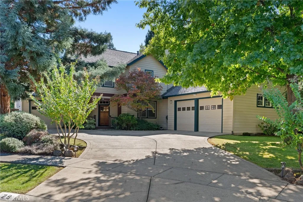 This charming 3-bedroom, 3.5 bath home perfectly blends comfort, convenience, and sustainability. Nestled on a quiet cul-de-sac just steps from Bidwell Park, a local coffee shop, and shopping, this home offers the ideal balance of tranquility and accessibility. Tall redwood trees in the spacious backyard offer plenty of privacy to relax by the pool. This home features a few separate living spaces for all your needs, including a living/family room, a cozy den, and an office. A half bathroom off of the exterior of the home provides convenience for guests while using the pool. Home has beautiful hardwood floors, a spacious kitchen island, soaring living room ceilings, stone fireplace, and owned solar.