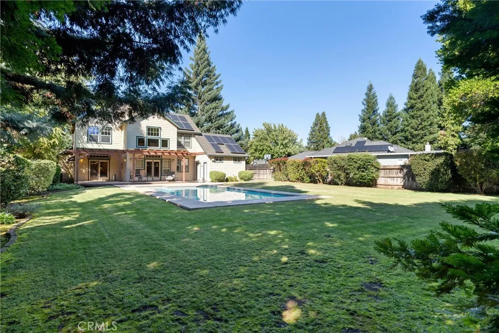 This charming 3-bedroom, 3.5 bath home perfectly blends comfort, convenience, and sustainability. Nestled on a quiet cul-de-sac just steps from Bidwell Park, a local coffee shop, and shopping, this home offers the ideal balance of tranquility and accessibility. Tall redwood trees in the spacious backyard offer plenty of privacy to relax by the pool. This home features a few separate living spaces for all your needs, including a living/family room, a cozy den, and an office. A half bathroom off of the exterior of the home provides convenience for guests while using the pool. Home has beautiful hardwood floors, a spacious kitchen island, soaring living room ceilings, stone fireplace, and owned solar.