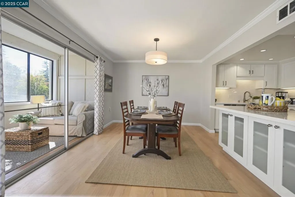 Charming unit located in the 55+ community of Rossmoor. The Sonoma style model is “move in ready” and offers many fabulous updates. The remodeled kitchen has stainless steel appliances, a large white quartz island with custom built-in cabinets and recessed lighting just perfect for entertaining guests. The crown moulding, newer interior doors, window coverings and beautiful hardwood floors bring elegance to the space. Gorgeous views of mountains and redwood trees make this a serene place to relax. There is an in-house laundry within an updated bathroom which provides everyday convenience. The community has a golf course, pools, gyms, club houses and endless activities! The security gate provides safety for all of the residents. This condominium won’t be on the market long, so come tour it today!