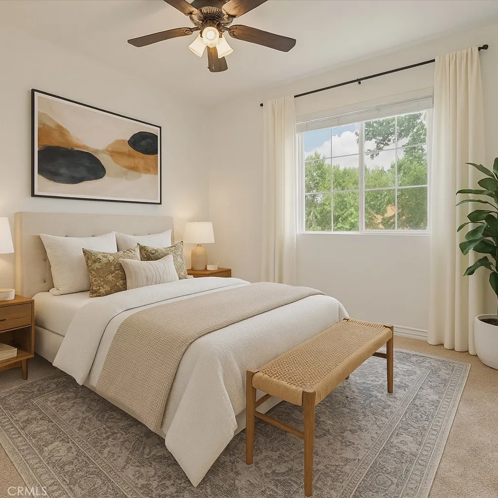 The home’s split-bedroom design offers privacy and natural light throughout. The primary suite includes dual sinks, a spacious walk-in closet + linen closet, newer carpet, and an upgraded ceiling fan. The bright den/office also features a new ceiling fan and is spacious enough to be converted into a third bedroom if desired. Outside, enjoy your low-maintenance backyard retreat with an Alumawood patio cover, remote-controlled market lights, a built-in gas BBQ island, and beautiful, low-maintenance artificial turf — ideal for quiet evenings or entertaining friends.