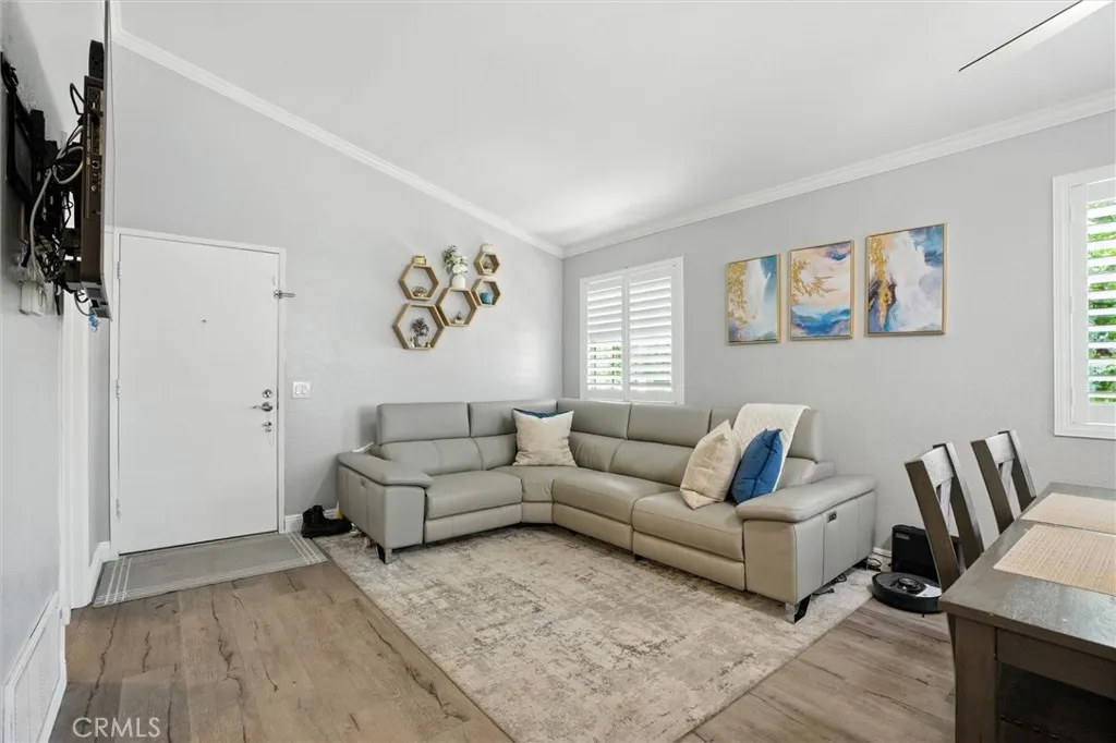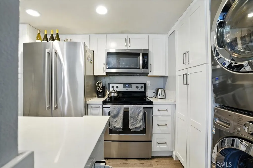 Beautifully Remodeled Upper. Light and bright 2-bedroom, 2-bath Mission Viejo Condo in the sought-after Las Palmas community. This upper-level home features vaulted ceilings, an upgraded kitchen with newer white cabinetry, quartz countertops, recessed lighting, an electric 4-burner stove, and a built-in microwave. A convenient laundry closet is located right in the kitchen for easy access. Enjoy newer double-pane windows and a sliding door that opens to your private balcony/patio—perfect for fresh air, evening BBQs, or simply relaxing outdoors. The home offers laminate flooring throughout for a modern and low-maintenance touch.