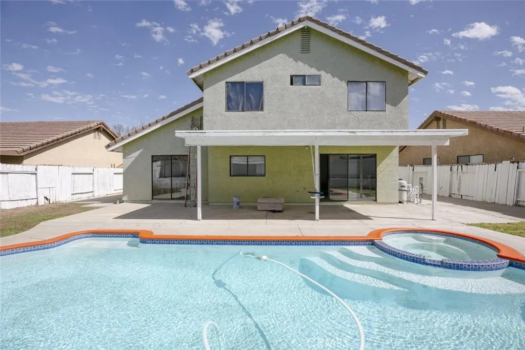 Located in a prime area near the AV Mall and Desert Aire Golf Course, this well-maintained 4-bedroom, 3-bath home is perfect for first-time buyers or those looking for a great investment opportunity. Inside, the spacious living room features a brick fireplace, creating a cozy focal point, while plenty of lighting enhances the open and airy feel. Tile flooring runs throughout the home, with laminate floors in the bedrooms for a stylish yet low-maintenance touch. Patio access from the living room seamlessly connects indoor and outdoor spaces. The open floor plan allows for easy flow between the kitchen, dining area, and living room, making it ideal for entertaining. The kitchen is beautifully updated, featuring granite countertops, recessed lighting, and ample cabinet space for storage. The primary bedroom offers a walk-in closet, providing extra convenience and space. Outside, the backyard is designed for entertaining, featuring a sparkling pool and spa, a large covered patio, and low-maintenance landscaping, making it perfect for relaxation and gatherings. With its fantastic location, modern upgrades, and entertainer’s backyard, this home is a must-see!