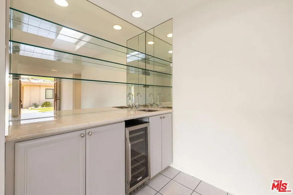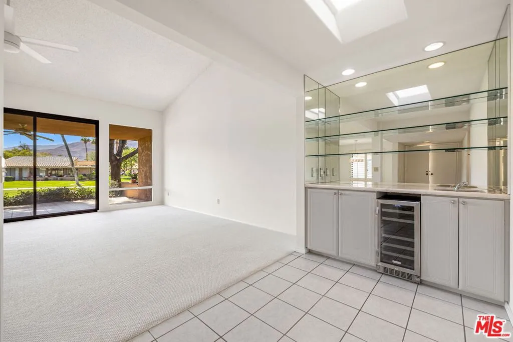 Sunrise Country Club is impeccably sited within its beautiful golf course community surrounded by panoramic mountain views, gated with 24 hour security in sought after Rancho Mirage. This 3 bedroom 2 bath end unit offers abundant natural light with an open concept great room with vaulted ceiling, featuring a spacious living room, dining with enclosed atrium featuring a wet bar, a covered terrace is accessible through wall of glass where lounging or outdoor dining enjoy link and fairway views. Additional features include an inside laundry room and an oversized garage with room for a golf cart and ample loft storage area. The architectural clubhouse includes a bar and grill, lounge, grand dining room with stunning lake and fairway views offering lunch and dinner, the club includes the 18-hole golf course, tennis and pickle ball courts, abundant swimming pools/spas and fitness center. Updates through the years include energy efficient dual glazed windows and Fleetwood slider. First class dining and shopping and medical are conveniently located within easy reach.