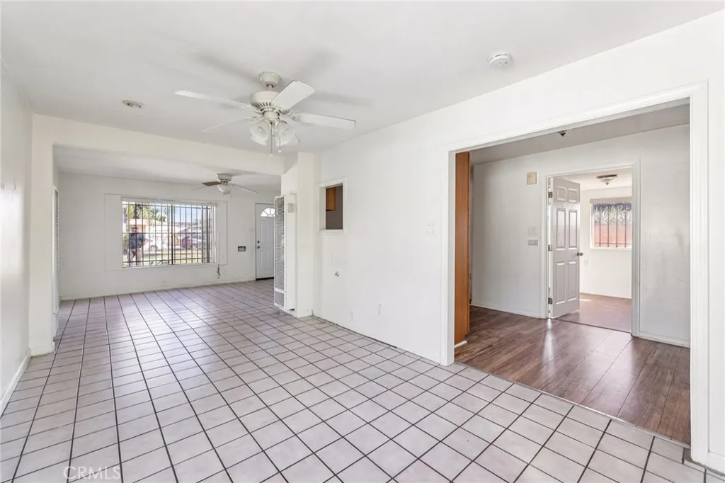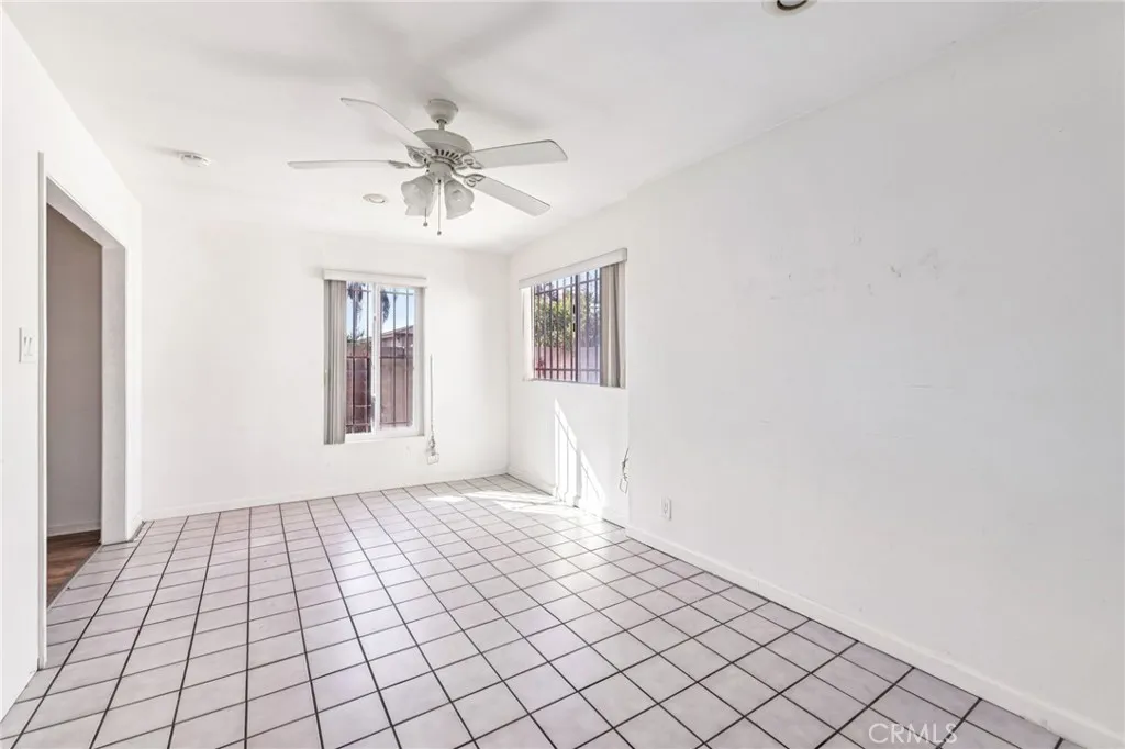 Inside you’ll find tile and premium flooring, ceiling fans, and vertical blinds throughout. The kitchen has plenty of cabinet space, plus washer and dryer hookups in a convenient laundry area. Two bedrooms sit on one side of the home with an adjoining bathroom, and there’s also an unpermitted bonus room that’s great for an office, gym, guest room, or extra living space.