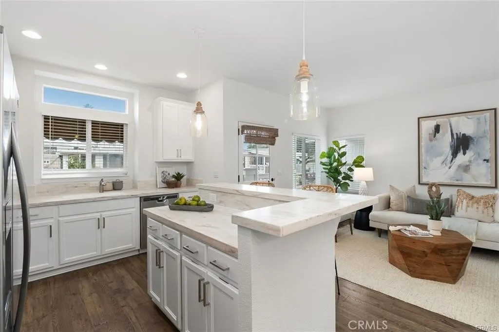 Welcome home to a beautiful turnkey 2 bedroom/2 bath cottage well located in Bayside Village in the heart of Newport Beach. Step up to the front porch and door which leads you inside to the great room with turnkey kitchen, dining area, living space boasting high ceilings and lots of light from numerous windows. You can step outside to the private patio yard or walk down the hall to the bedrooms, bathrooms and laundry room. The master suite has lots of space & walk in closet, custom bathroom with built in cabinets. There is a light and bright second bedroom and bathroom. The laundry room has built in storage and doorway to carport. Living area has lots of windows and open kitchen with lots of cabinets, stainless appliances and an island. Enjoy privacy in the fenced patio yard. The carport has a lockable shed for your storage items. Property has no one behind for additional privacy.