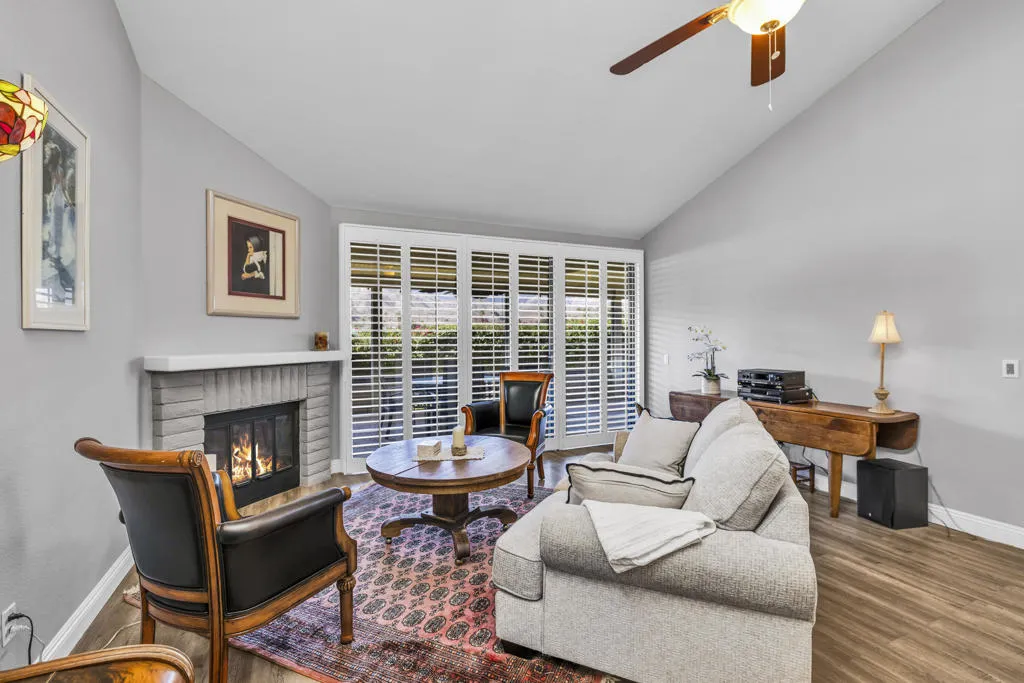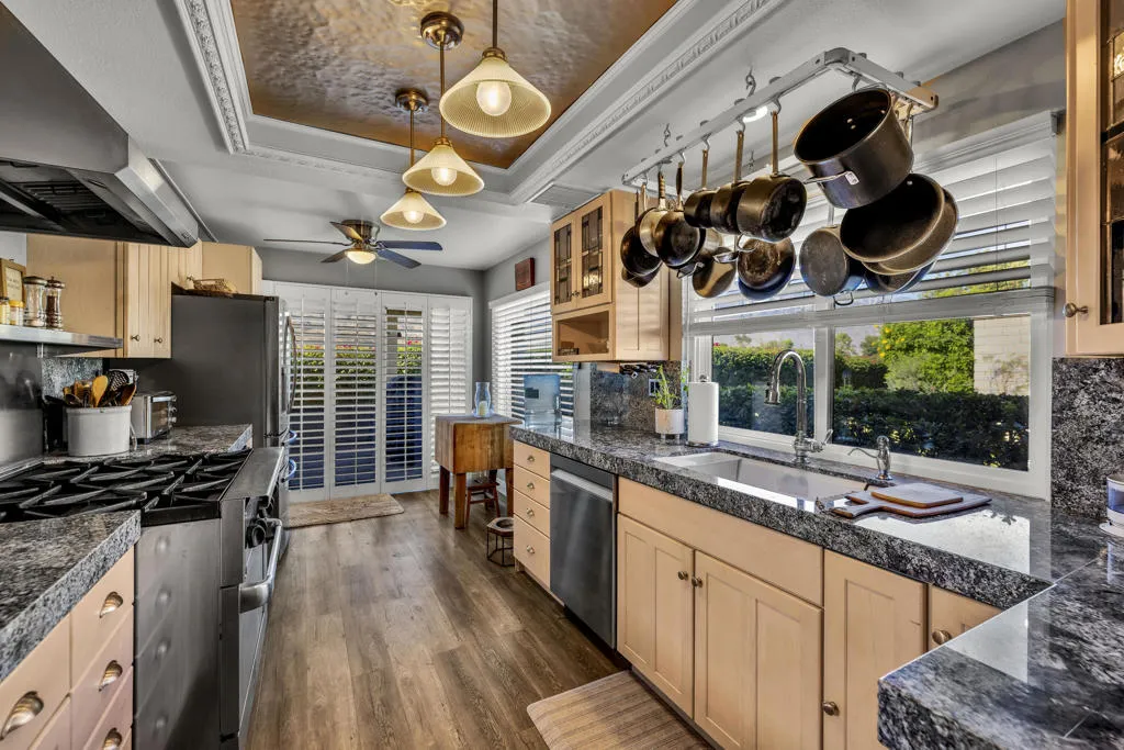 Back on Market–Buyers changed their minds. Welcome to this beautifully updated, turn-key furnished 3 bed, 2 bath unit located on one of the most desirable streets in Cathedral Canyon Country Club. Pride of ownership is obvious as you enter the double doors into the foyer. The recently remodeled kitchen opens onto the light and bright living room with volume ceilings, as well as a dining room just waiting to share cozy dinners. The kitchen also features a breakfast nook and a breakfast bar, perfect for everyday meals. High-end appliances, including a Wolf range, updated lighting, and granite counters make cooking in the chef’s kitchen a joy. A gas fireplace in the living room is perfect for enjoying those chilly winter evenings as you watch the sun set over the magnificent San Jacinto mountains. Upgraded wood plank laminate flooring throughout lends an elegant feel while allowing for easy maintenance. Updated six-inch baseboards complete the contemporary look. The third bedroom is currently used as a separate den but could easily be turned back into a bedroom. The guest room features a private covered patio. The primary bedroom with lighted walk-in closet includes ensuite featuring a frameless shower and quartz counters. Sliders open from the primary bedroom, living room, and kitchen onto the south-facing covered patio. A custom mister system makes it the ideal place for morning coffee as you drink in your stunning mountain views. New HVAC system installed in 2024 cools the unit quickly and efficiently, even in the heat of summer. Your two-car garage with loft provides ample storage. HOA includes garbage, exterior and roof maintenance, cable, and internet. Cathedral Canyon Country Club offers golf, tennis, and clubhouse. With easy access to upscale dining, shopping, and Palm Springs airport, this home offers the best of desert resort living in a desirable gated community.