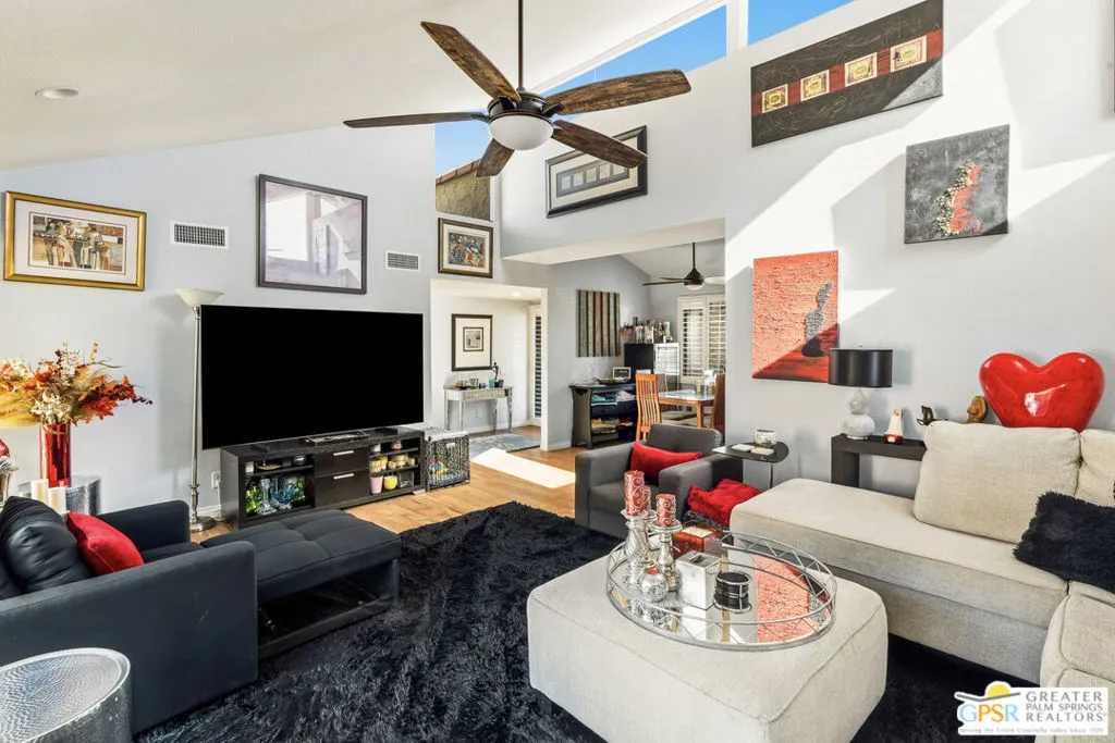 Welcome to your desert sanctuary nestled in the highly sought-after SaddleRock Estates community, one of Palm Springs’ most iconic mid-century enclaves in South Palm Springs. This single-level 2-bedroom, 2 bath condominium offers an exceptional blend of architectural character, thoughtful updates, and resort-style living with spacious open-concept living with vaulted ceiling and clerestory windows flooding the interior with natural light, all just steps from Smoke Tree Commons, boutique shopping, cafes, and scenic hiking trails. Sliding glass doors open to the private patio from the living room and primary bedroom with views of the San Jacinto mountains. Attached two-car garage. SaddleRock Estates, designed by architectural master Hugh Kaptur, is a boutique gated community with just 24 homes, making every resale a rare opportunity. New land lease extension to 2077 is available. Contact LA for details. 24 hours required for all showings.