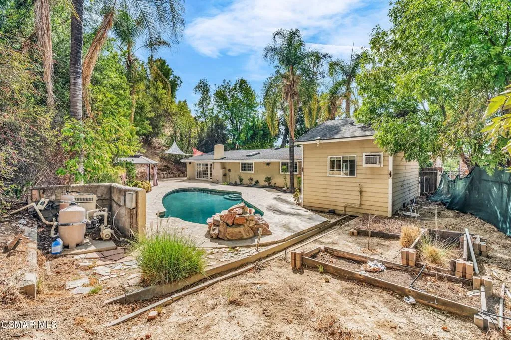 Calling all HANDYMEN!! This secluded property is priced to sell quickly at $990,000 which considers everything this property HAS and DOES NOT HAVE! Sitting on almost 28,000′ lot, this four-bedroom/3 full bath, (TWO are primary suites!!) single family – single story home has over 3,200′ of interior space (including several additions that may or may not be permitted). There is a newer gated driveway and fence that leads to two large carports and the residence. There is a double door entry, spacious living room and dining room with 2 sliding French doors to exterior, a large updated granite kitchen with gas cooktop island with stainless steel hood, double ovens, stainless steel farm-style sink with garden window overlooking side yard, ample storage, recessed lighting, dishwasher, refrigerator and breakfast room with built-in secretary. Indoor laundry room with washer/dryer included. Additional features: Plantation shutters, walk-in closets in the both primary suites, tall baseboards, vaulted ceilings, ceiling fans, skylights, 2 fireplaces, 2 HVAC systems, 2 water heaters, vinyl and tile flooring throughout. There is a large flagstone patio surrounding the pool in the rear yard, an outbuilding that would be ideal as a pool changing room, home office, art studio, playroom or…ADU?! There are several sheds and storage areas dotted throughout the property and a covered gazebo. All this in a great private location close to Kaiser Permanente, Woodland Hills Academy, shopping and convenient freeway access.