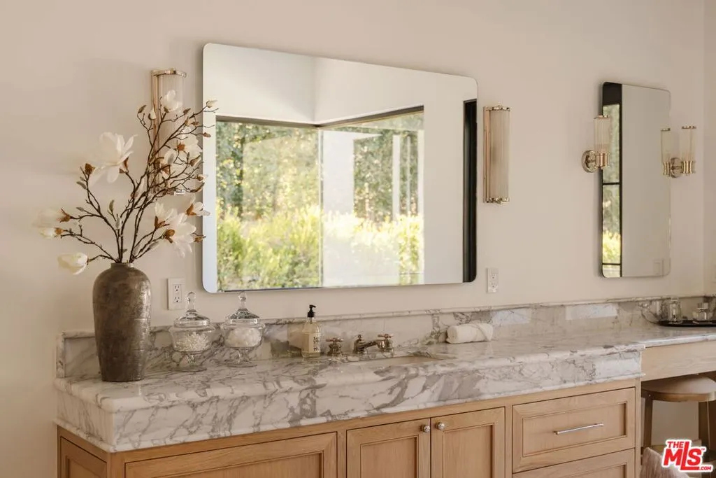 Poised behind gates on an expansive and secluded three-quarter-acre parcel, this newly completed Traditional estate is a triumph of scale, craftsmanship, and refined architectural vision. Set within one of Brentwood’s most sought-after enclaves, the residence spans nearly 11,000 square feet of exquisitely tailored living space, comprising a grand main residence and a fully detached, two-story guest house — each executed with an exacting standard of design and finish. A dramatic double-height foyer introduces interiors of quiet grandeur, where custom millwork, hand-selected natural stone, and a gallery-like flow elevate both form and function. The formal living room is anchored by a marble fireplace and sculptural wine bar, while the adjoining dining room opens entirely to the outdoors via a retractable glass wall, creating seamless flow to the estate’s lush grounds. At the center of the home, a marble-clad chef’s kitchen combines striking aesthetics with professional-grade performance, featuring Sub-Zero and Wolf appliances, an artisan coffee bar, and bespoke cabinetry. A sunlit breakfast area opens to a gracious family room, while a lounge and seated wet bar, dedicated office, guest suite, and two powder rooms complete the main level. An elevator and dual staircases ascend to the private quarters above, where five ensuite bedrooms are thoughtfully arranged, including an extraordinary primary retreat with soaring beamed ceilings and glass doors opening to a private terrace. Two couture-inspired dressing rooms and a spa-caliber bath, complete with a dual steam shower and sunlit soaking tub, offer a daily ritual of serenity. An upper-level screening room, wet bar, gym, and additional family room provide flexible spaces for recreation and relaxation. Outside, the resort-style grounds unfold with effortless sophistication: a sparkling pool and spa with Baja shelf and auto cover, a covered and heated entertaining pavilion, outdoor kitchen, firepit lounge, sport court, and vast emerald lawn, all surrounded by mature hedging that ensures privacy and tranquility. The two-story guest house offers unparalleled versatility, featuring a living room, kitchenette, powder room, and an upper-level bedroom suite with a private balcony, ideal for a pool house, accommodating extended stays, or a studio. Additional highlights include a fully integrated home automation system, dual laundry rooms, and a 3-car EV-ready garage accessed via a cobblestone motor court. More than a home this is a rare architectural statement, exquisitely composed and beautifully aligned with the timeless spirit of the Westside.