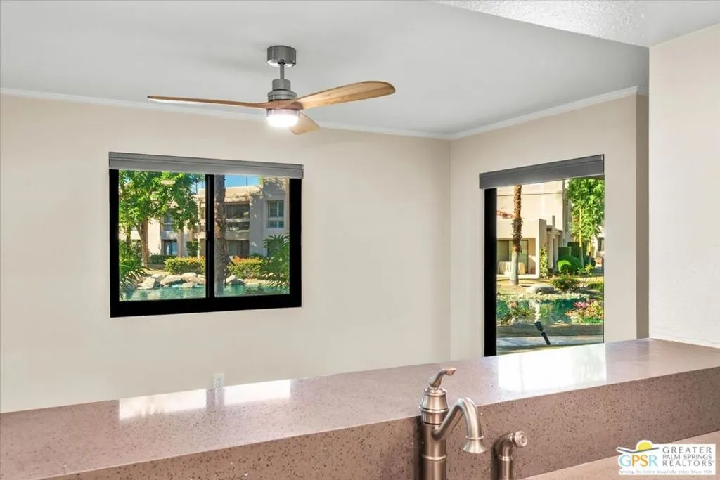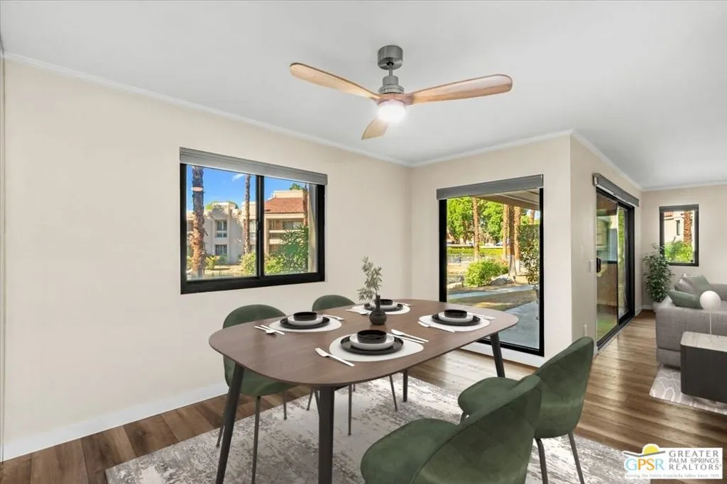 Welcome to this beautifully maintained lower-level condo in the desirable community of Canyon Shores. Featuring two bedrooms and two baths, this thoughtfully updated home offers a peaceful desert retreat designed for comfort and ease of living.Inside, you’ll find updated windows and sliding glass doors, easy-care flooring, and a bright, open layout that feels spacious and inviting. Step out to your private patio, where you can relax beside the tranquil water feature and enjoy the lush, landscaped greenbelt that surrounds this serene community. Located on fee simple land (you own the land) this home combines lasting value with an enviable resort-style lifestyle. Residents of Canyon Shores enjoy multiple pools and spas, tennis and pickleball courts, a fitness center, and more, all within a beautifully maintained gated setting. The HOA covers water, trash, and building and grounds maintenance, ensuring a worry-free living experience. Perfectly situated between Palm Springs and Palm Desert, Cathedral City provides convenient access to shopping, dining, golf, and entertainment throughout the Coachella Valley. Ideal as a full-time residence, seasonal escape, or investment property, this inviting condo offers the perfect blend of comfort, location, and ownership advantage.