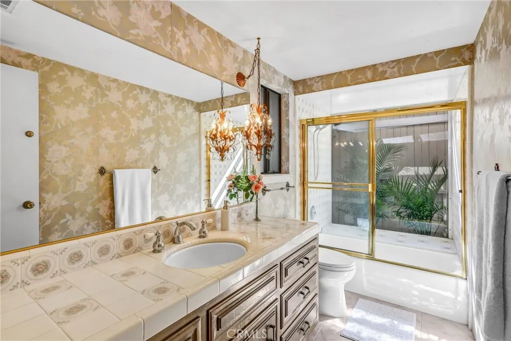 Back inside, the primary bedroom offers direct access to the pool deck and includes three closets. The ensuite boasts his & her vanities, a glass shower, and a garden tub with views of the lush surrounding garden.