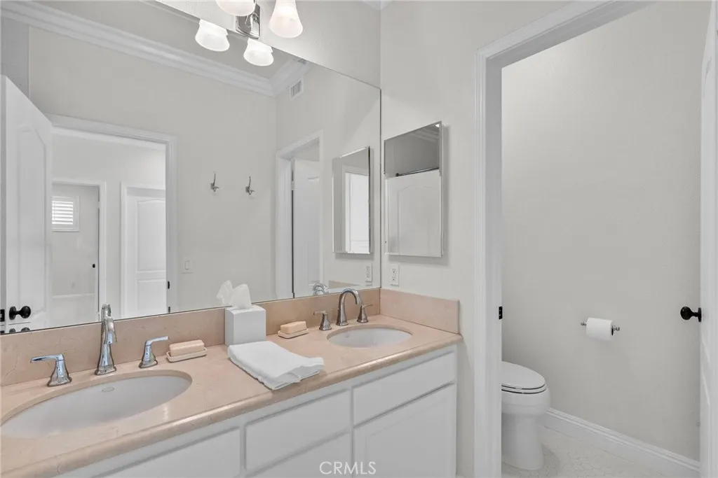 Model perfect home in the beautiful, gated Verdigris community! An epitome of luxury & sophistication combining elegance & modern design, this home is a true dream sanctuary. The private backyard is perfect for entertaining featuring a built-in spa, stamped concrete covered patio, inviting gas fireplace, and soothing waterfall, all amongst lush green landscaping. The front yard welcomes you with low maintenance turf, beautiful trees and shrubs and an inviting porch with waterfall. Step inside to the formal living room and dining room with crisp white walls, cathedral ceilings, plantation shutters throughout, gorgeous chandeliers, crown molding throughout, and neutral stone flooring. Completely remodeled light and bright kitchen features custom kitchen cabinets, 8 burner Wolfe range, built-in Sub Zero refrigerator/freezer, gorgeous stone countertops, kitchen island opens to family room with stone fireplace framed with bookcases and TV cabinet. Gorgeous custom staircase leads to loft, new carpet in hallway and bedrooms, exquisitely remodeled primary suite/primary bath with custom closets and marble flooring, upstairs laundry room with utility sink. Downstairs bedroom with new carpet, remodeled guest bath with shower. 3 car finished garage with new outdoor carpet squares, storage, work bench, full sink, and tankless water heater. 2 yr old energy efficient HVAC and transferrable solar! HOA with pool/spa, child’s pool, children’s playground, tennis courts, park, & BBQ’s, close to award winning schools, bike paths, hiking trails, freeway access, shopping, and public transportation