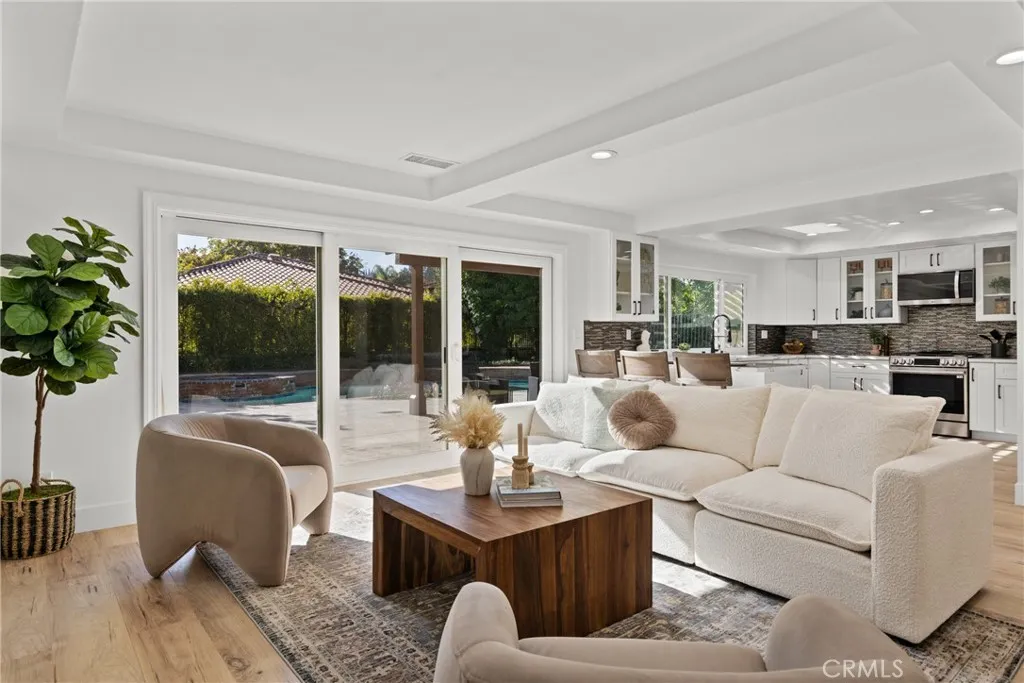 Vaulted ceilings and new flooring flow throughout, creating a bright, open indoor-outdoor living experience. The spacious layout includes a proper dining room, family room, and great room—perfect for entertaining or relaxing with loved ones.