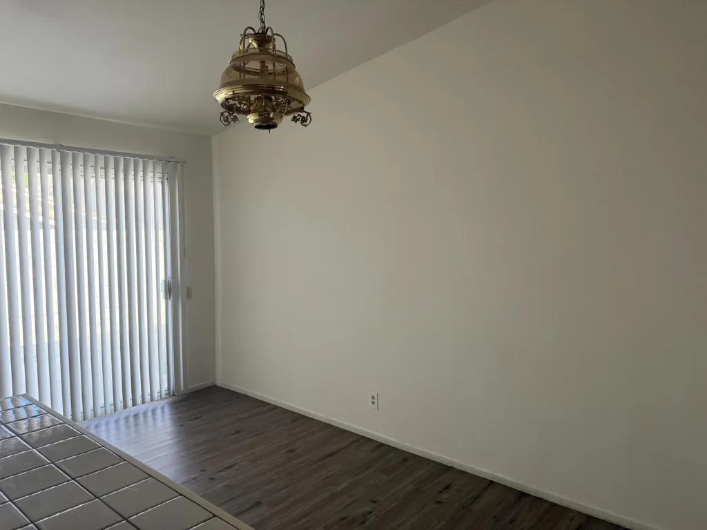 Welcome to this charming home featuring a brightly painted white interior and dark brown wood like vinyl flooring throughout. The living room offers a cozy fireplace, creating a warm and welcoming space to relax. The dining area is accented by a vintage style chandelier and opens to a kitchen full of character, complete with a bar countertop, white tile surfaces, colored tile backsplash, and white cabinetry for a bright, timeless look.Each bedroom is generously sized and continues the clean, modern design with matching vinyl flooring and crisp white walls. The bathrooms maintain the home’s cohesive style with tile flooring, white tile countertops, white cabinets, and tiled showers, one of which includes a bathtub. A separate laundry area adds convenience, and the attached 2 car garage provides ample parking and storage. Enjoy the ease of low maintenance desert landscaping in the front yard, designed for both beauty and efficiency. Feel free to schedule your viewing now!