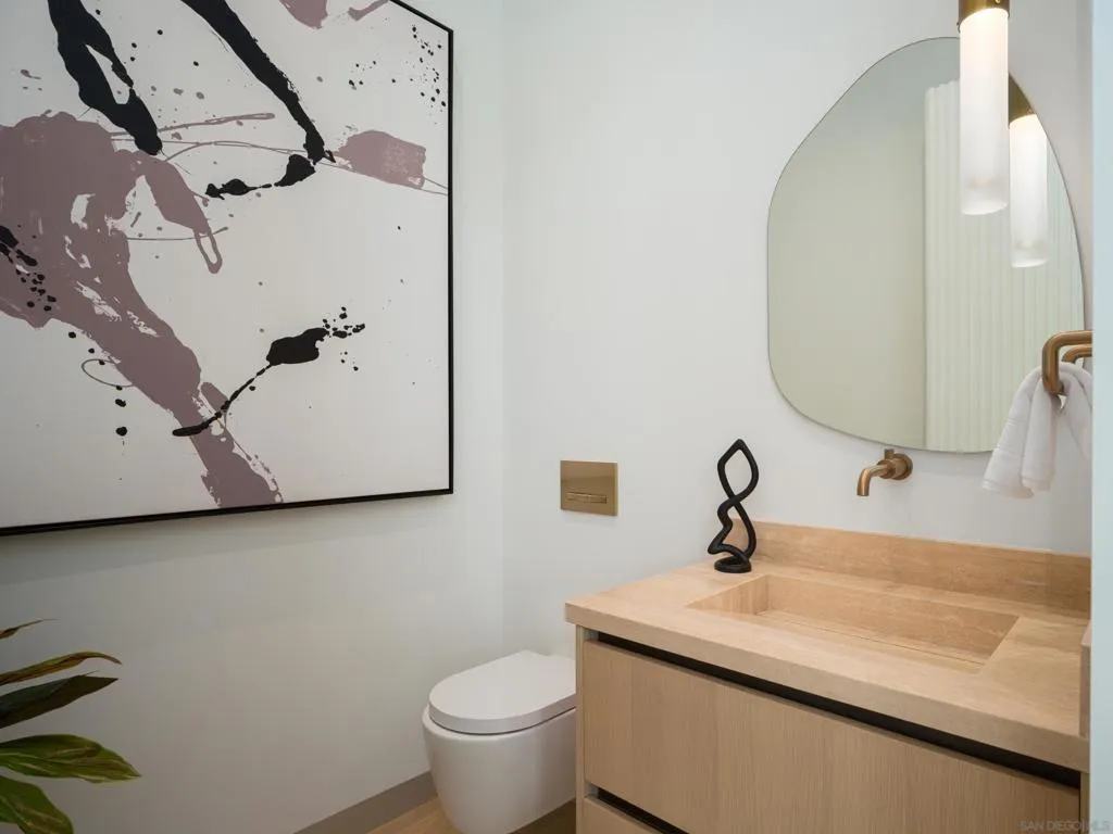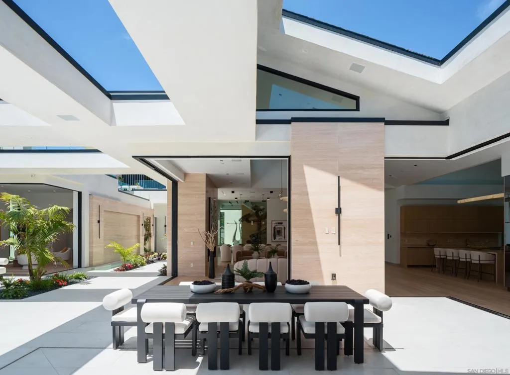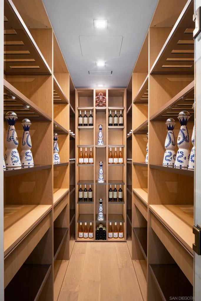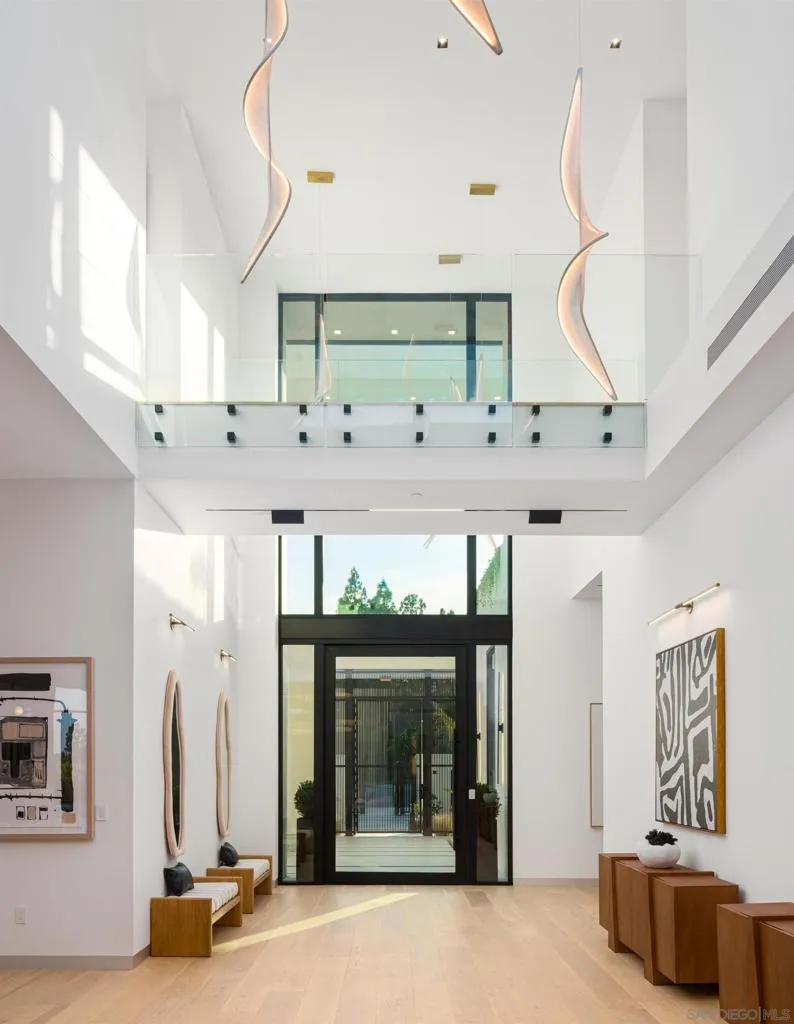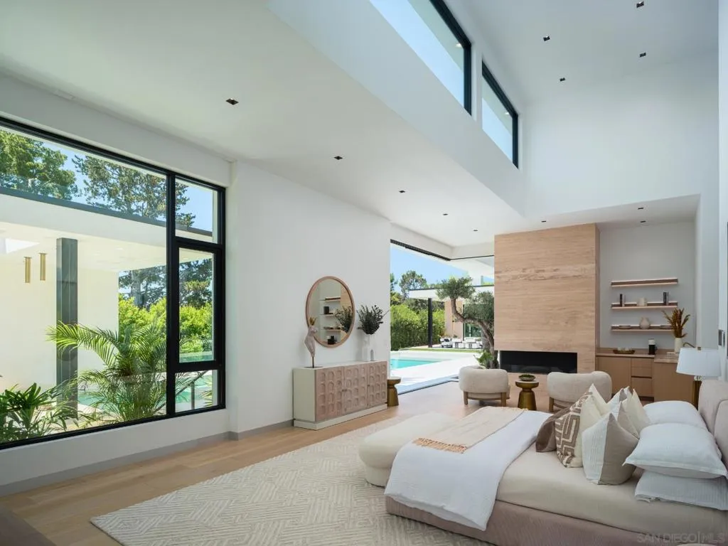 Perched in the heart of the esteemed Muirlands, this fully double gated estate built for privacy and security, features custom aluminum modern gates that open to a double courtyard motor court with custom glass doors and oversize garages, adding a touch of exclusivity to this architectural marvel. This one of a kind residence stands as a bold testament to architectural brilliance and luxury living. A true masterpiece of modern design featuring soft tones, soaring ceilings, and a flawless fusion of sleek lines and warm natural accents. This is more than a home; it is an unparalleled expression of contemporary elegance and timeless sophistication, setting a new standard for opulent living in San Diego. At first glance, the scale of the residence is awe-inspiring, with towering 19-foot ceilings that amplify the sense of space and light throughout. A grand courtyard entry sets the tone, featuring a tranquil reflecting pond, stainless steel sculpture, and a stunning 26-foot water feature adorned with travertine slabs—an exquisite welcome that encapsulates the home’s commitment to timeless design. Inside, 11-foot glass pocket doors and clear story windows effortlessly blend indoor and outdoor spaces, inviting natural light to play across sleek, modern interiors. The Southern exposure bathes each room in warmth, complemented by cantilevered steel beam construction that spans the entire length of the residence, showcasing a harmony of form and function rarely seen. The main level epitomizes luxury with its maid quarters, three en-suite guest bedrooms, and a primary suite complete with a designer closet that exudes spaciousness and elegance. White oak floors and Italian Kitchen-designed cabinets underscore the home’s commitment to quality craftsmanship, while a double travertine island and top-of-the-line Miele appliances grace the expansive main kitchen along with a Thermador professional grade prep and catering kitchen, ensuring culinary excellence at every turn. Designed with entertainment in mind, the lower level is a haven for leisure and recreation, featuring a state-of-the-artFull Swing Golf and Sports simulator, a 12-person movie theater, temperature controlled wine cellar and display, and a full-sized gym complimented by a dry sauna and steam room. A bar and billiards room offers a sophisticated space for gatherings, while the adjacent flat, usable yard beckons families with its potential for outdoor activities and additional amenities like a sports court. Outside, the 60 ft pool stands as a focal point of the main level amenities, with its brilliant pure white finish, baja shelf and spa. The custom swim-up bar features a full kitchen, complete with a U-shaped wraparound travertine slab bar and full outdoor kitchen and fireplace. The ambiance continues to enchant with a one bedroom guest house, complete with its own kitchenette and living area. Tropical landscaping surrounds the majestic pool, outlined by beautiful olive trees, walls of lush green hedges that guarantee total privacy. Ascending to the top level reveals a staircase adorned with a remarkable 300-year-old olive tree, guiding residents to a spacious office or art studio, accompanied by a versatile flex room ideal for a library, music room, or lounge area. Evenings come alive in the outdoor movie theater with a 148″ YOLO outdoor television, complemented by an additional outdoor kitchen and fireplace, perfect for hosting unforgettable gatherings under the stars. The property features a smart home full automation RTI system inclusive of 32 security cameras and Doorbird gate systems, 79 surround sound speaker system, Lutron lighting system, pre-wired for custom blinds, complete VRF multizone Daikin HVAC system, and touch screen capabilities from Ipads throughout the property as well as your personal mobile device for remote access. With a doublewide and double height garage on each of side of the house the garage has the capability of becoming a 4 car garage on bot…