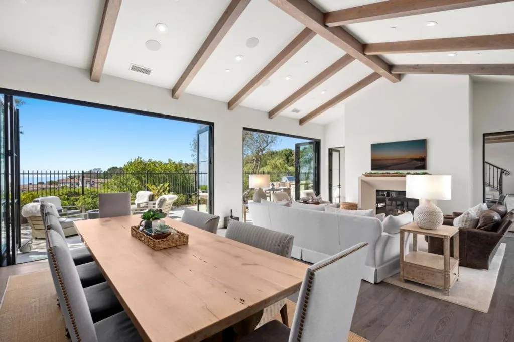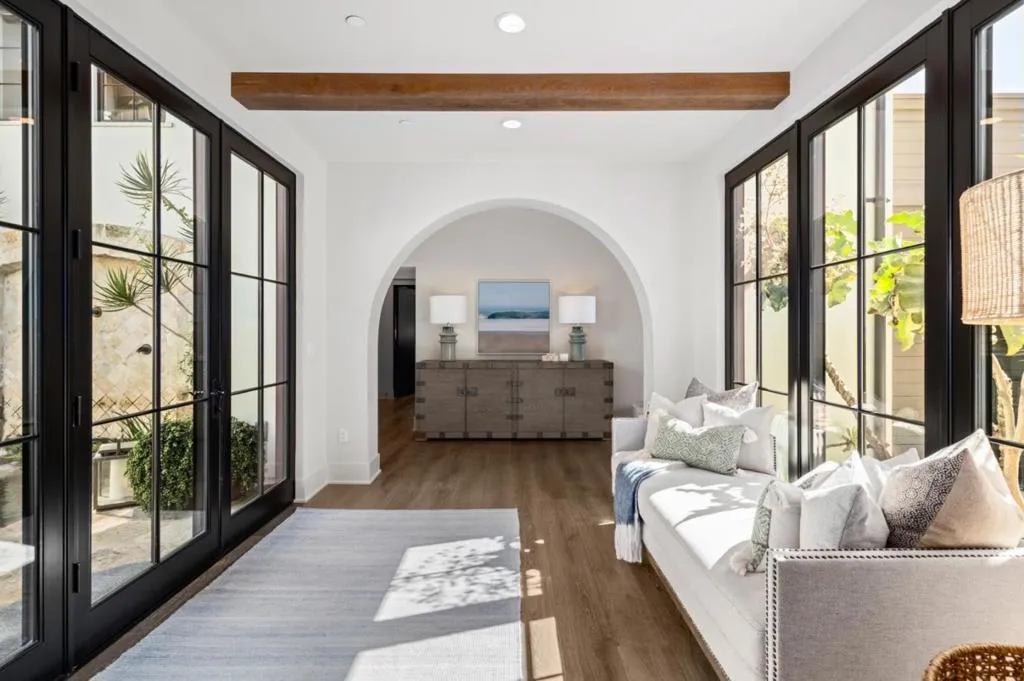 Nestled within the prestigious guard-gated enclave of Crystal Cove, this exquisite 5,300 sqft estate blends coastal elegance with modern sophistication. A grand entry, framed by koi ponds & cascading water features, sets the stage for this serene retreat. Designed for seamless indoor-outdoor living, retractable doors connect the great room & gourmet kitchen to multiple entertaining spaces. A custom outdoor kitchen, oversized spa, and lush landscaping create a private coastal oasis. The chefs kitchen boasts an oversized island, Wolf & Sub-Zero appliances, a spacious butlers kitchen, and ample storage. Wood-beamed ceilings, wide-plank French Oak floors, and marble & quartzite countertops add timeless charm. Smart home features include Savant automation, SONOS sound & solar panels. The main-level primary suite offers a spa-inspired haven, while two upstairs guest suites and a versatile bonus room provide additional comfort. A private guest casita within the gated courtyard serves as an exclusive retreat. Above the loggia, a separate office boasts a secluded workspace. Residents enjoy access to the Canyon Clubs pool, fitness center & sports courts, while Crystal Cove Promenades upscale dining, shopping & the beach are just moments away. Experience the pinnacle of coastal luxury.