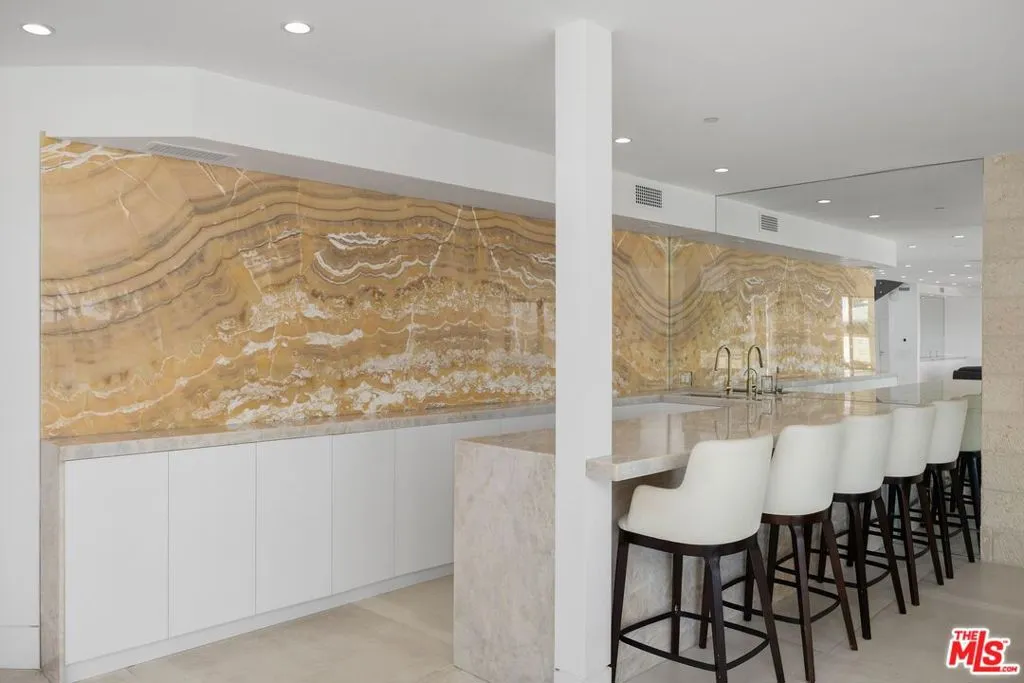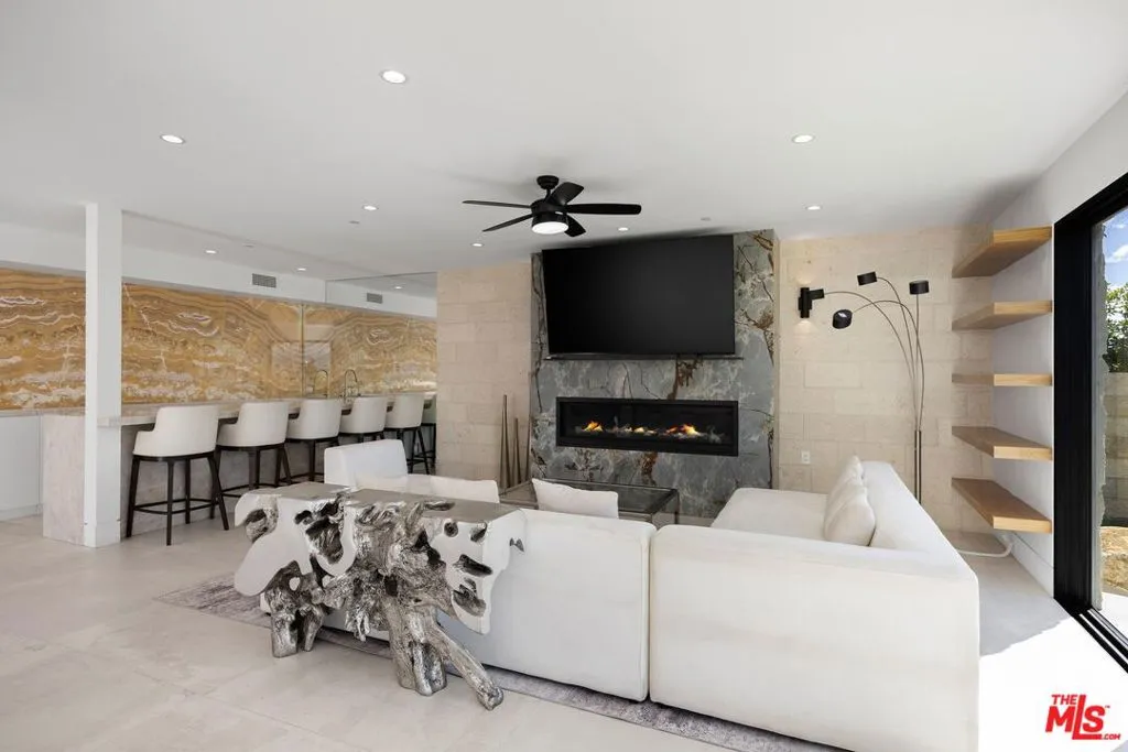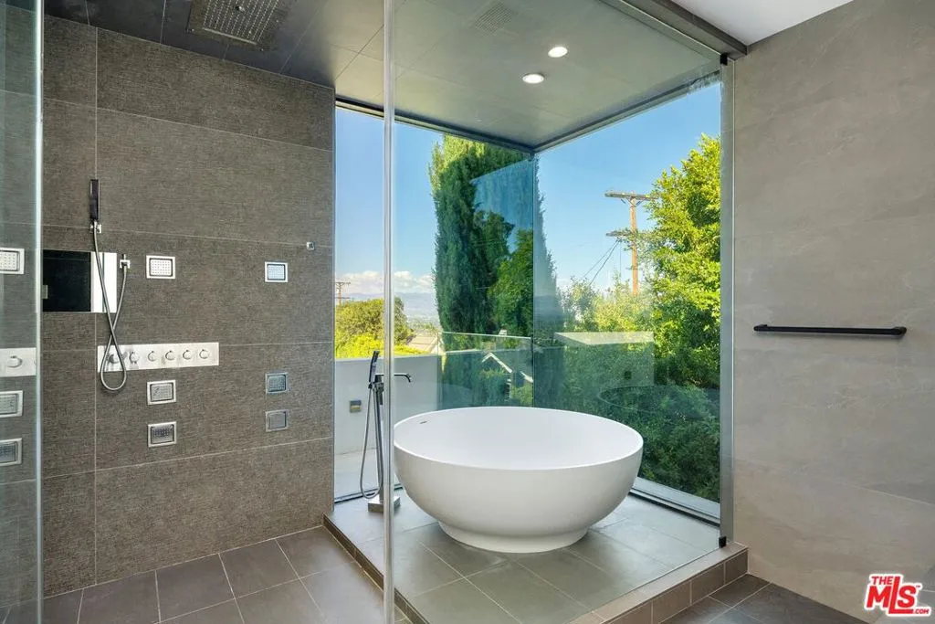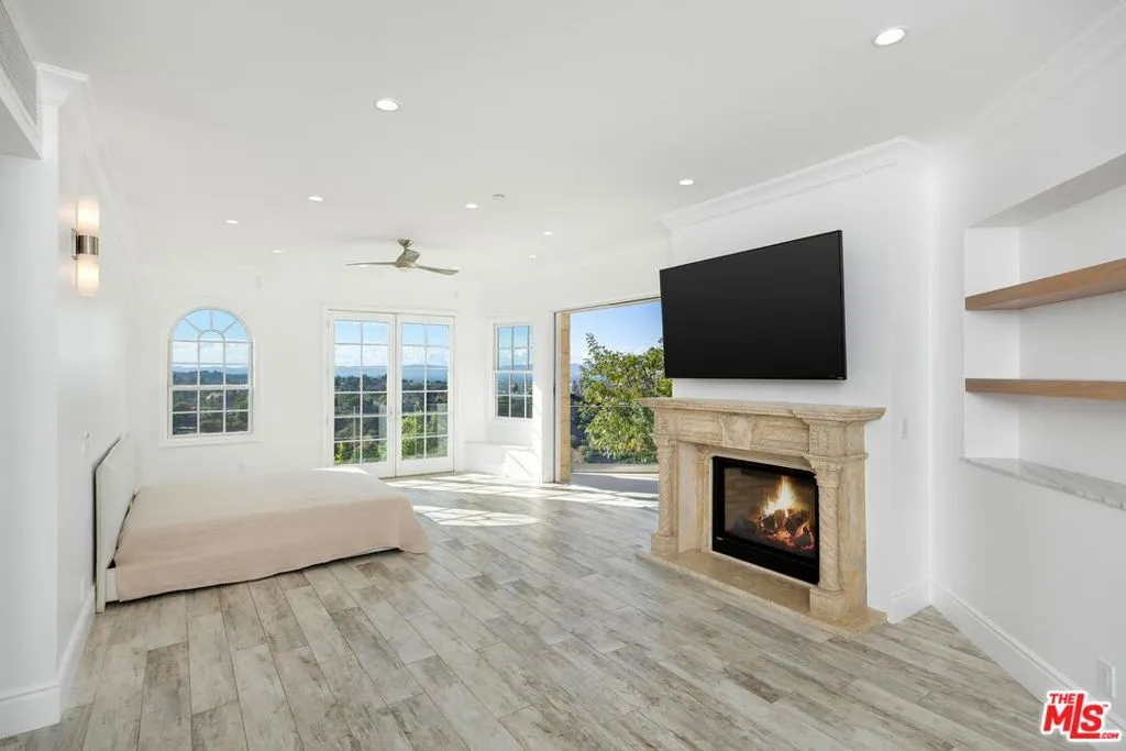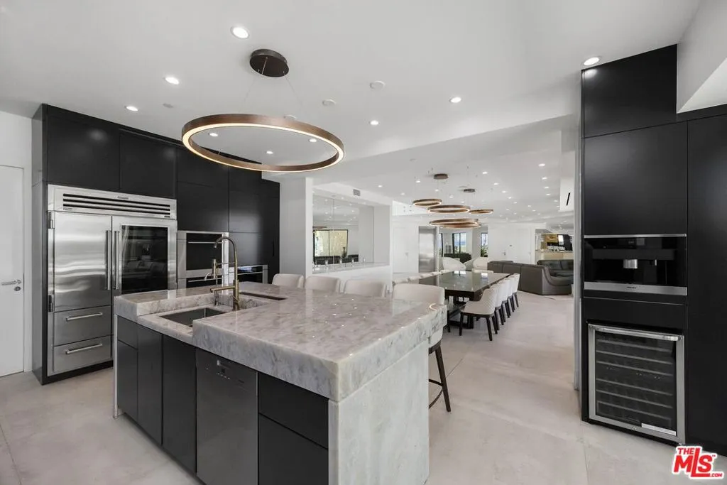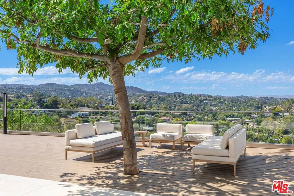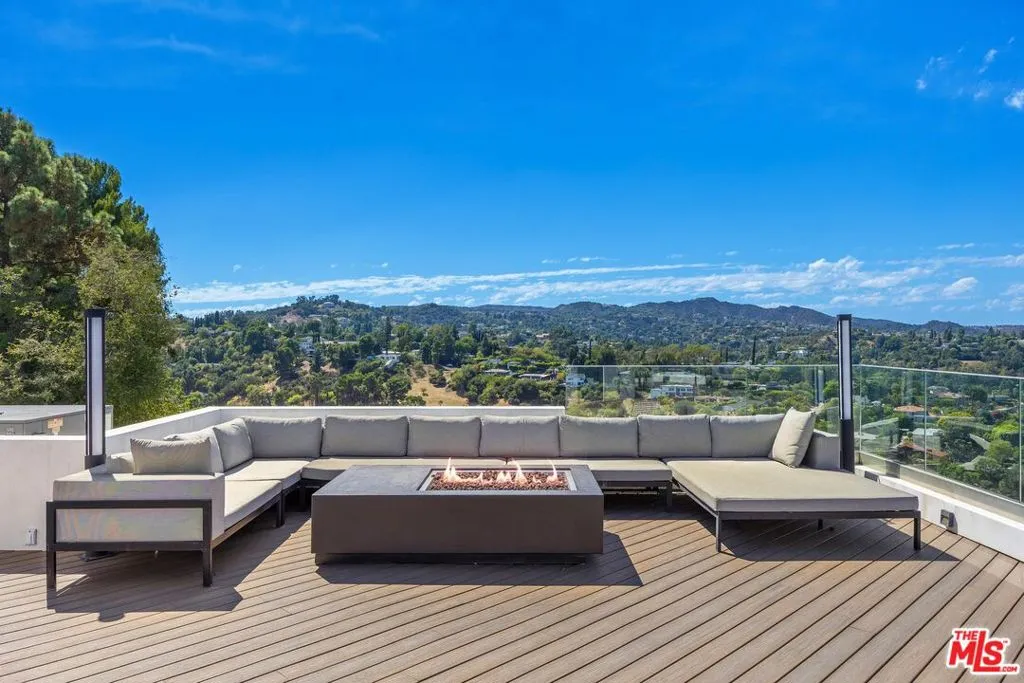 Tucked behind gates in prime Sherman Oaks, this newer 5BD/7BA estate blends privacy, sweeping views, and seamless indoor-outdoor living. A custom Kolbe glass entry sets the tone, leading into a dramatic main level with soaring ceilings allowing natural light to fill the space. A bar area and formal dining room allow plenty of space for friends and family to gather. The chef’s kitchen features a 6-burner Wolf range, Miele appliances, a glass-front Sub-Zero, and a striking Cristallo White Quartzite island. Floor-to-ceiling pocket doors open to the resort-style backyard, designed with a covered patio, pool, spa, wood decking, and a full outdoor kitchen. An elevator takes you to the rooftop deck, where city, valley, and mountain views create the ultimate backdrop for entertaining. Two fire pits, a second outdoor kitchen, and a private shower round out this impressive space. Upstairs, dual primary suites showcase distinct luxuries. One offers a wraparound balcony with 180-degree views, swing seating, fire feature, and a spa-like bath with steam shower, rainfall heads, and a freestanding tub positioned toward the horizon. The other includes a fireplace, dual balconies, and a custom walk-in closet. Two additional ensuite bedrooms round out the level, one with its own kitchenette, private entry, and fireplace. Every detail has been thoughtfully selected, from electronic bidet toilets in each bathroom to the home theater, Blue Roma Quartzite fireplace, Yellow Onyx bar, and Jerusalem stone exterior. Just minutes from Ventura Boulevard and scenic hiking trails, this residence balances sophistication, comfort, and unmatched views. Also available for lease, inquire within.