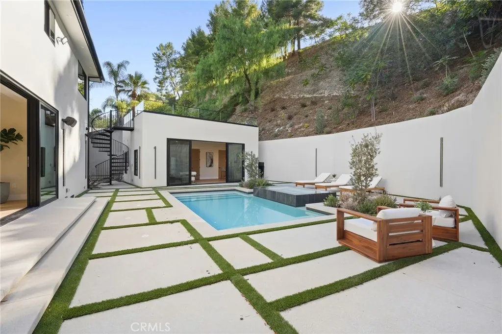 Outside, your own private paradise awaits: a sparkling pool and spa with cascading waterfall, mature olive trees, outdoor fireplace, and a fully equipped BBQ island with bar seating. Multiple lounging zones and a spacious side yard provide endless backdrops for content creation or sunset entertaining. A detached guest house/ADU doubles as the perfect studio, gym, or creative suite.
