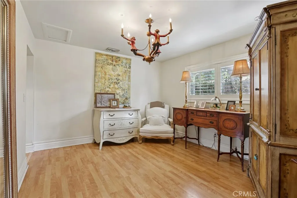 Exquisite Single-Story Home in Prime Woodland Hills – South of the Boulevard! Welcome to a rare offering in one of Woodland Hills’ most coveted neighborhoods—an impeccably appointed, move-in-ready single-story residence boasting timeless elegance, luxurious finishes, and over 2,550 SQFT of thoughtfully designed living space. This sophisticated 3-bedroom + office, 2-bathroom home effortlessly blends classic charm. Step through the formal foyer into a stunning entertainer’s living room, highlighted by soaring wood-beamed ceilings, a statement gas fireplace, and an open, inviting layout. The gourmet kitchen adorned with elegant French-style cabinetry, a premium 6-burner Viking gas range, built-in refrigerator, and a cozy breakfast nook framed by an expansive picture window showcasing tranquil views of the lush, manicured backyard. Custom French doors seamlessly connect indoor and outdoor living, opening to a breathtaking private oasis designed for both relaxation and grand entertaining. The resort-style backyard features a sparkling Pebble Tec pool, a covered patio with a charming outdoor fireplace, vibrant landscaping, multiple mature fruit trees, and an ambiance of total seclusion. Perfectly positioned just minutes from the high-end shops and restaurants of The Village at Topanga, Westfield Mall, and a short drive to the iconic Calabasas Commons, this extraordinary residence offers luxury, location, and lifestyle at an exceptional value. A true gem and one of the best-priced homes in this prestigious enclave.