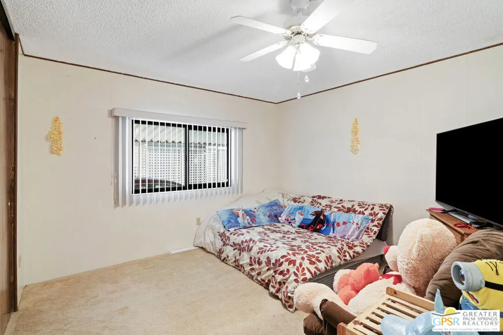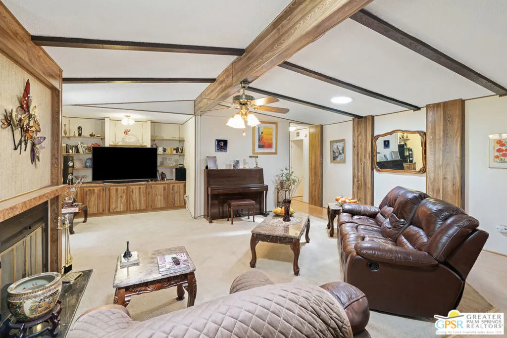 Welcome Home to this Triple wide home in the 55+ Desert View Mobile Home Club. As you enter this home, you will notice the vaulted beamed ceilings in the open living area with a Fireplace and built-in shelving. Just off the living area is a formal dining room with a built-in display cabinet and a window that showcases the view. The primary bedroom has an ensuite with a separate shower and tub and features a large walk-in closet. The generously sized guest room also has a walk-in closet. The Kitchen, with breakfast bar, has ample space for all your cooking needs and is open to the dining area. Off the kitchen is your Laundry room with extra storage and a seating area that can be used as a folding/sewing area or can be used to set up your home office. Enjoy the outdoors on your wrap-around covered patio with stunning views of the desert landscape and surrounding mountains, or gather fresh citrus fruit from several trees located on the property. Park amenities include a pool, mineral spas, a recreation room, and a picnic area. Make your appointment today to view this wonderful home with its stunning views.