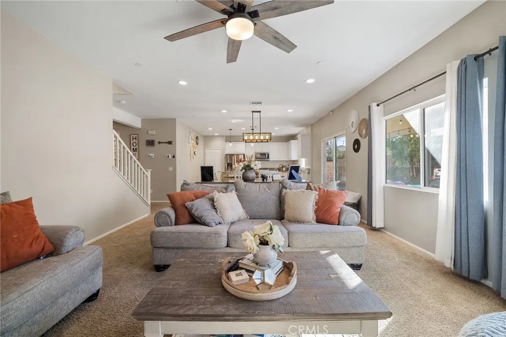 Step inside to find a bright, open-concept layout filled with natural light and stylish neutral tones. The inviting living room flows seamlessly into the dining area and modern kitchen, featuring granite countertops, a large center island, stainless steel appliances, and ample cabinet space perfect for entertaining and family gatherings.